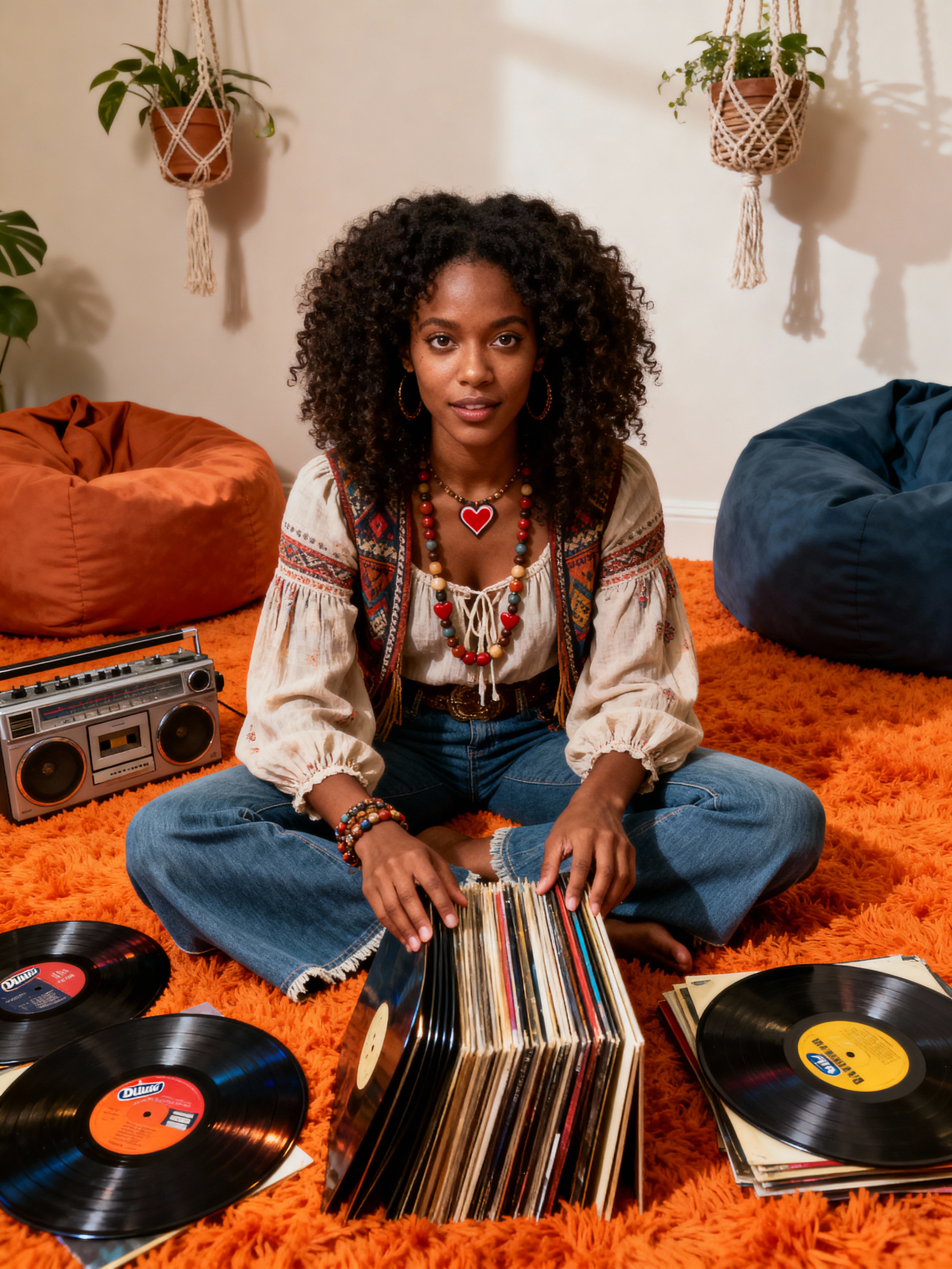 model sitting cross-legged on orange shag carpet, wearing peasant blouse with bell-bottom jeans and love beads , organizing a collection of vinyl LPs and 45s, portable stereo with cassette deck nearby, bean bag chairs and hanging macramé planters decorating the room