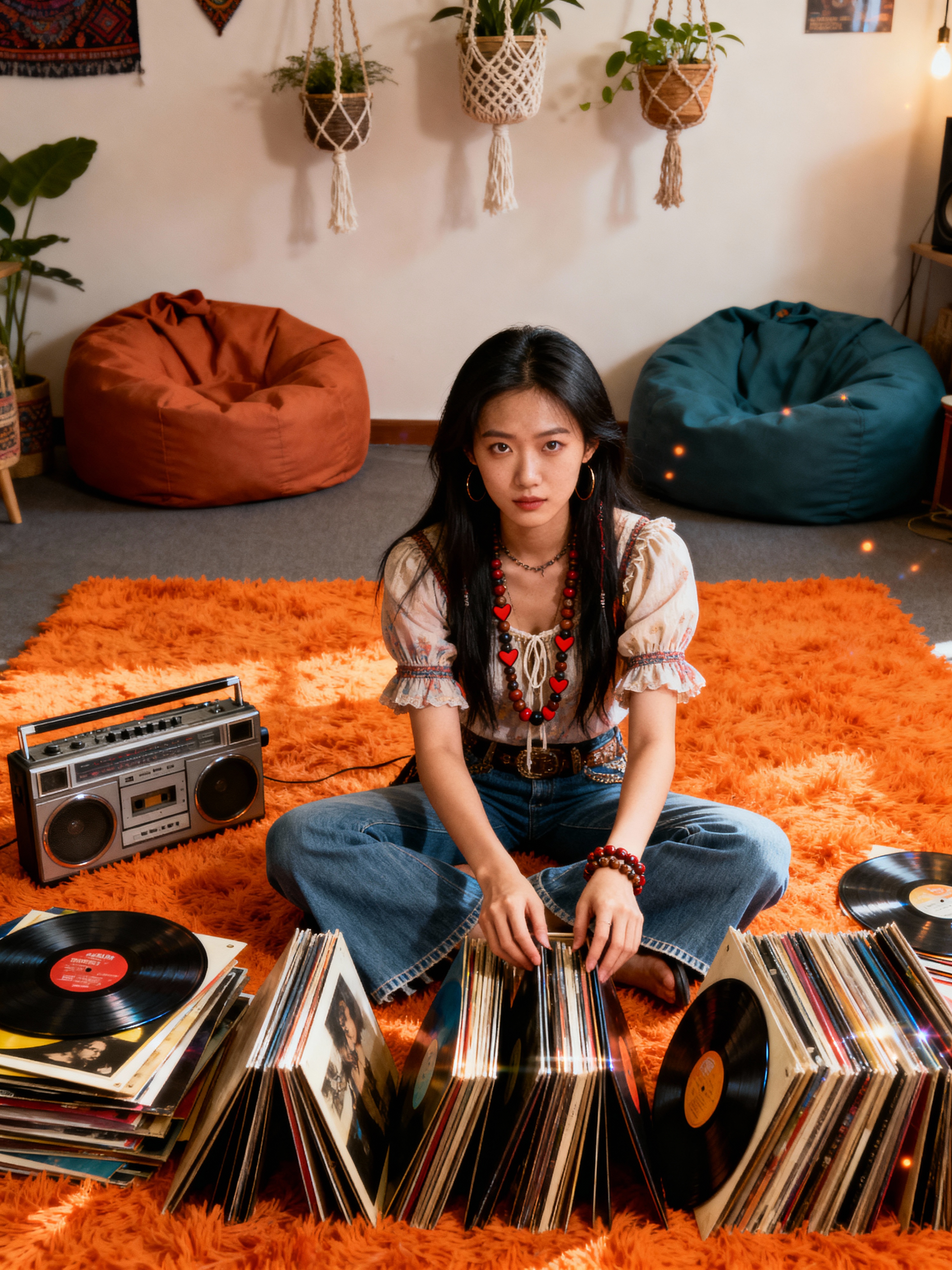 model sitting cross-legged on orange shag carpet, wearing peasant blouse with bell-bottom jeans and love beads , organizing a collection of vinyl LPs and 45s, portable stereo with cassette deck nearby, bean bag chairs and hanging macramé planters decorating the room
