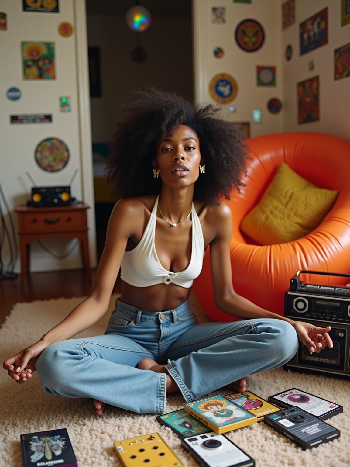 model sitting cross-legged on shag carpet, wearing butterfly hair clips, a halter top, and bell-bottom jeans , organizing a collection of cassette singles, portable radio nearby, inflatable furniture and holographic stickers decorating the room