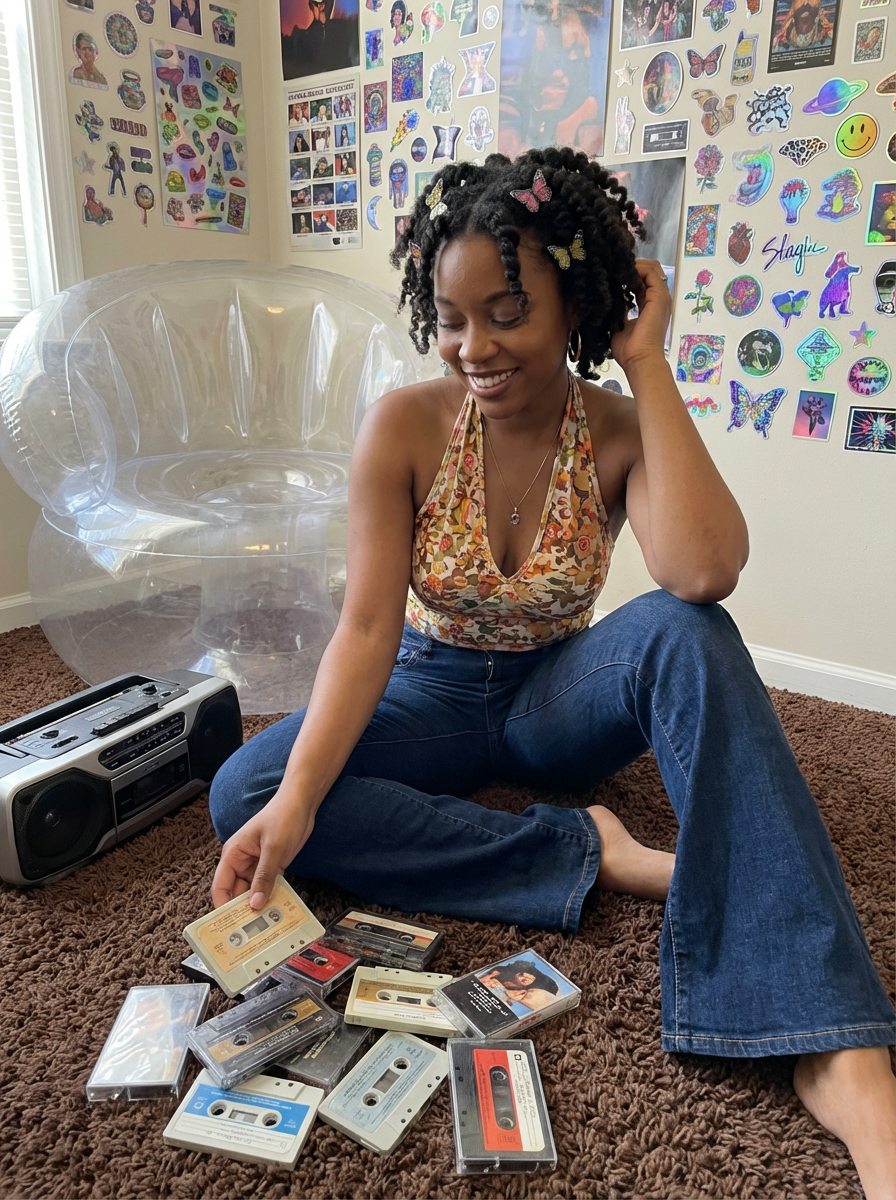 model sitting cross-legged on shag carpet, wearing butterfly hair clips, a halter top, and bell-bottom jeans , organizing a collection of cassette singles, portable radio nearby, inflatable furniture and holographic stickers decorating the room