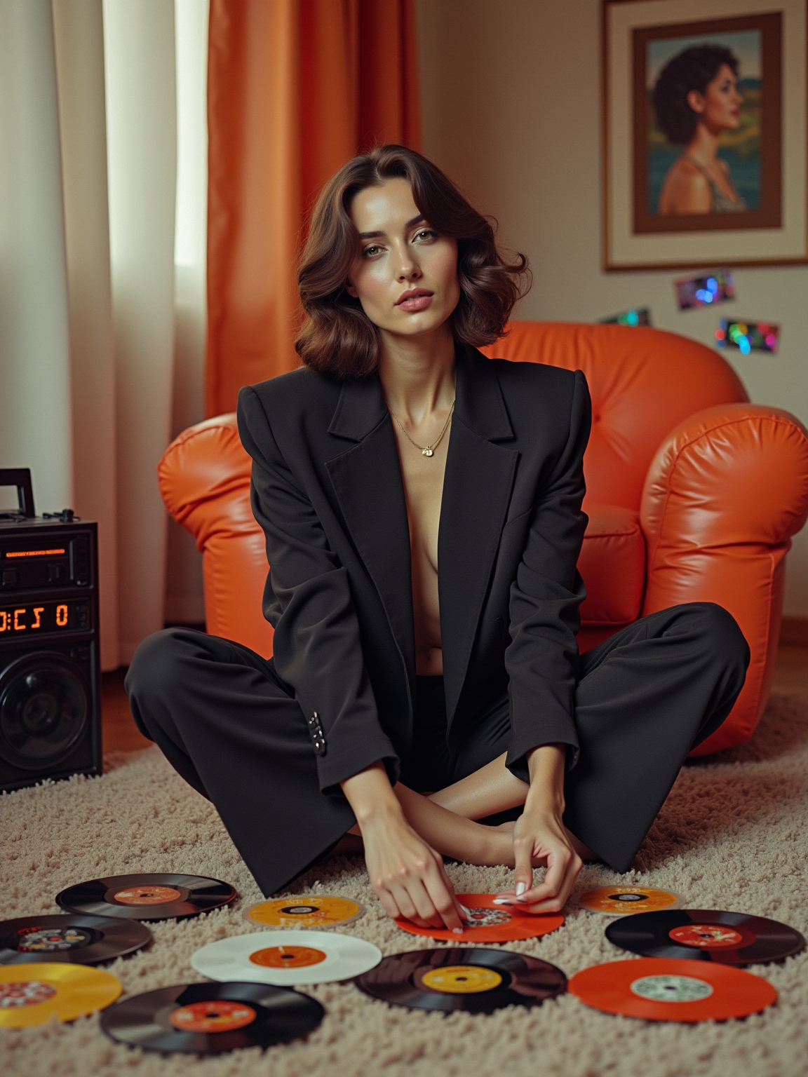 model sitting cross-legged on shag carpet, wearing oversized blazer with massive shoulder pads and stirrup pants , organizing a collection of 45 RPM singles, portable radio with digital display nearby, inflatable furniture and holographic stickers decorating the room