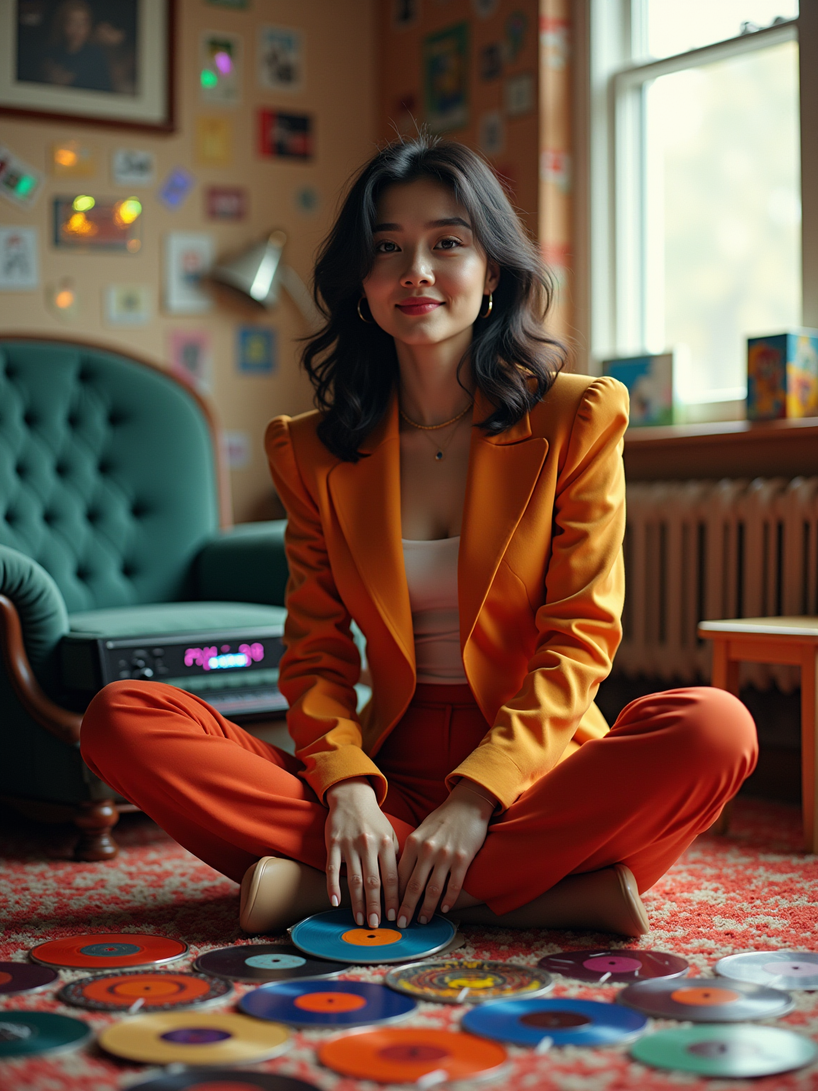 model sitting cross-legged on shag carpet, wearing oversized blazer with massive shoulder pads and stirrup pants , organizing a collection of 45 RPM singles, portable radio with digital display nearby, inflatable furniture and holographic stickers decorating the room