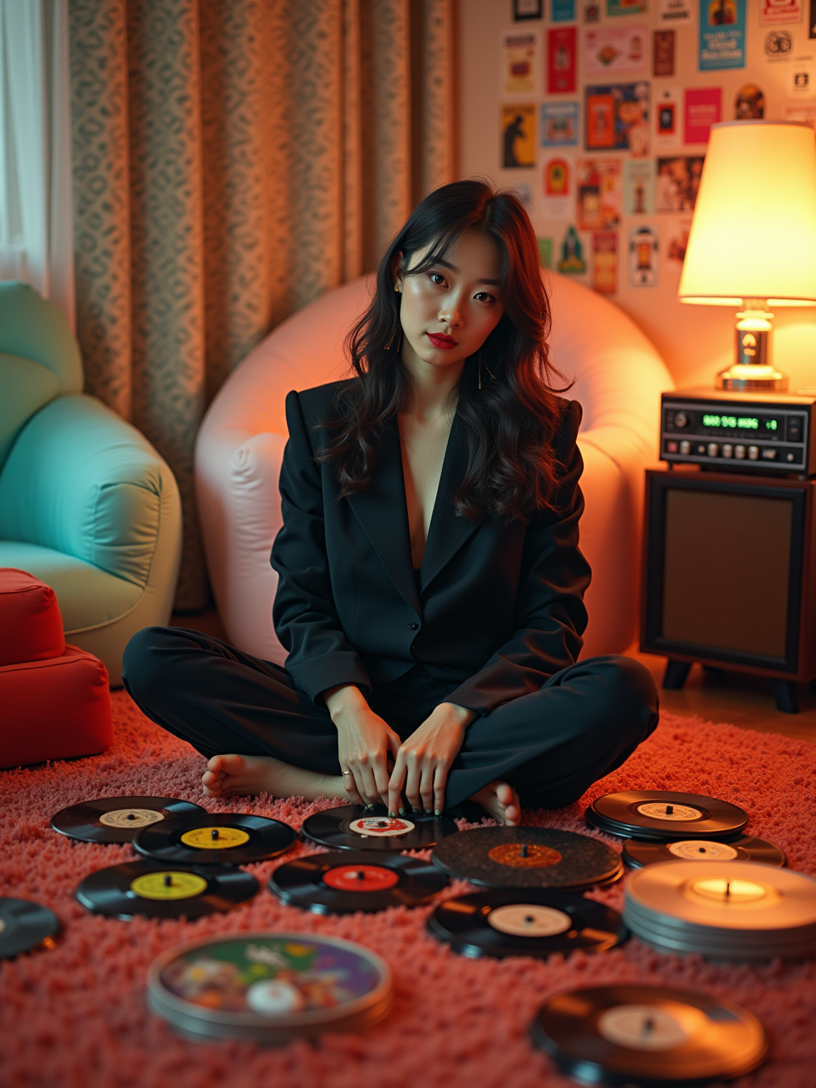 model sitting cross-legged on shag carpet, wearing oversized blazer with massive shoulder pads and stirrup pants , organizing a collection of 45 RPM singles, portable radio with digital display nearby, inflatable furniture and holographic stickers decorating the room