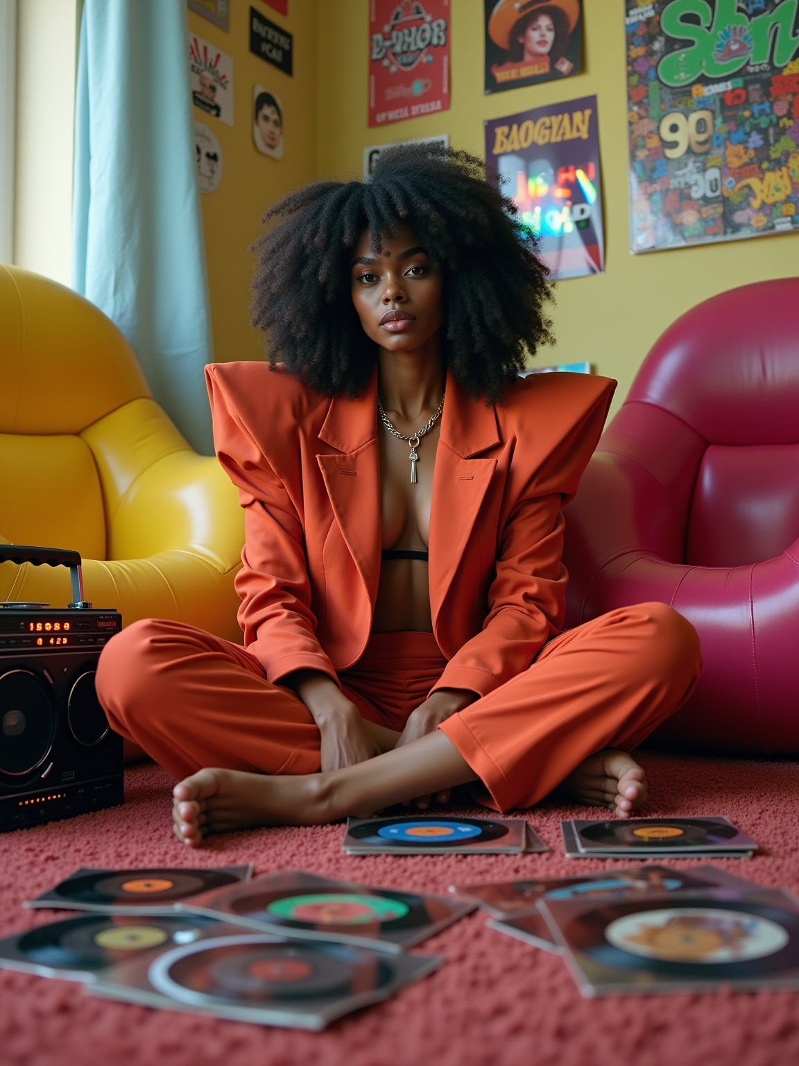 model sitting cross-legged on shag carpet, wearing oversized blazer with massive shoulder pads and stirrup pants , organizing a collection of 45 RPM singles, portable radio with digital display nearby, inflatable furniture and holographic stickers decorating the room