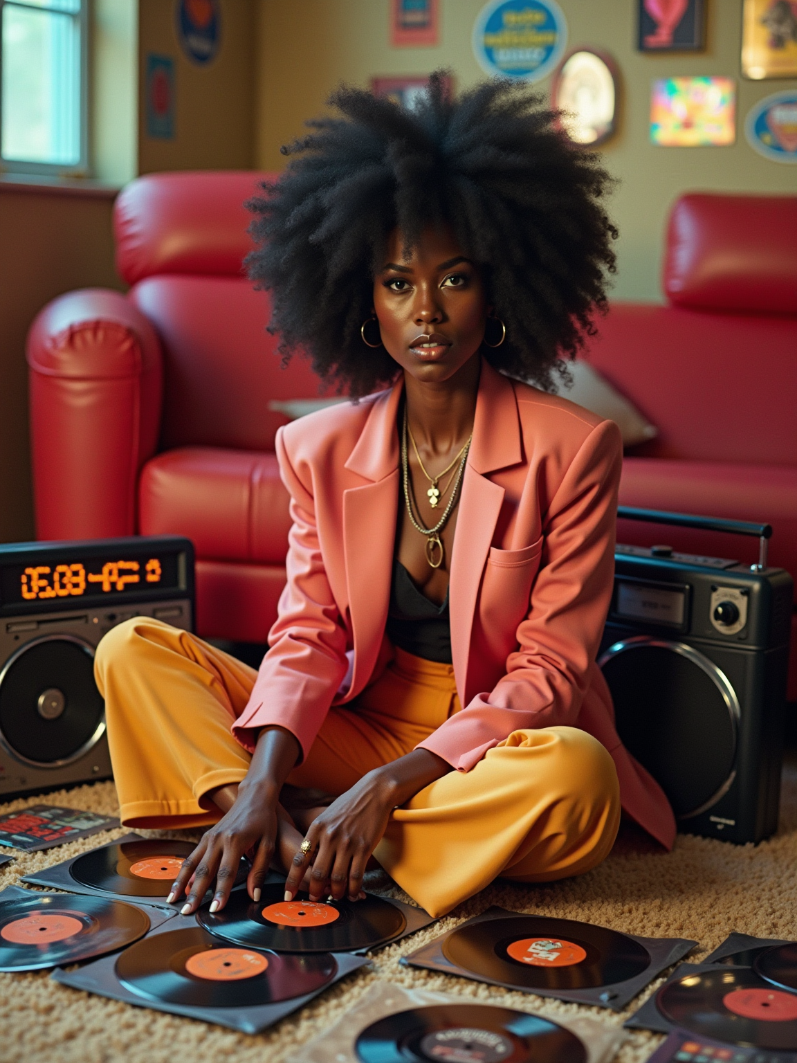 model sitting cross-legged on shag carpet, wearing oversized blazer with massive shoulder pads and stirrup pants , organizing a collection of 45 RPM singles, portable radio with digital display nearby, inflatable furniture and holographic stickers decorating the room