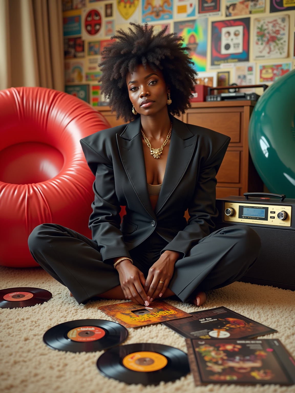 model sitting cross-legged on shag carpet, wearing oversized blazer with massive shoulder pads and stirrup pants , organizing a collection of 45 RPM singles, portable radio with digital display nearby, inflatable furniture and holographic stickers decorating the room