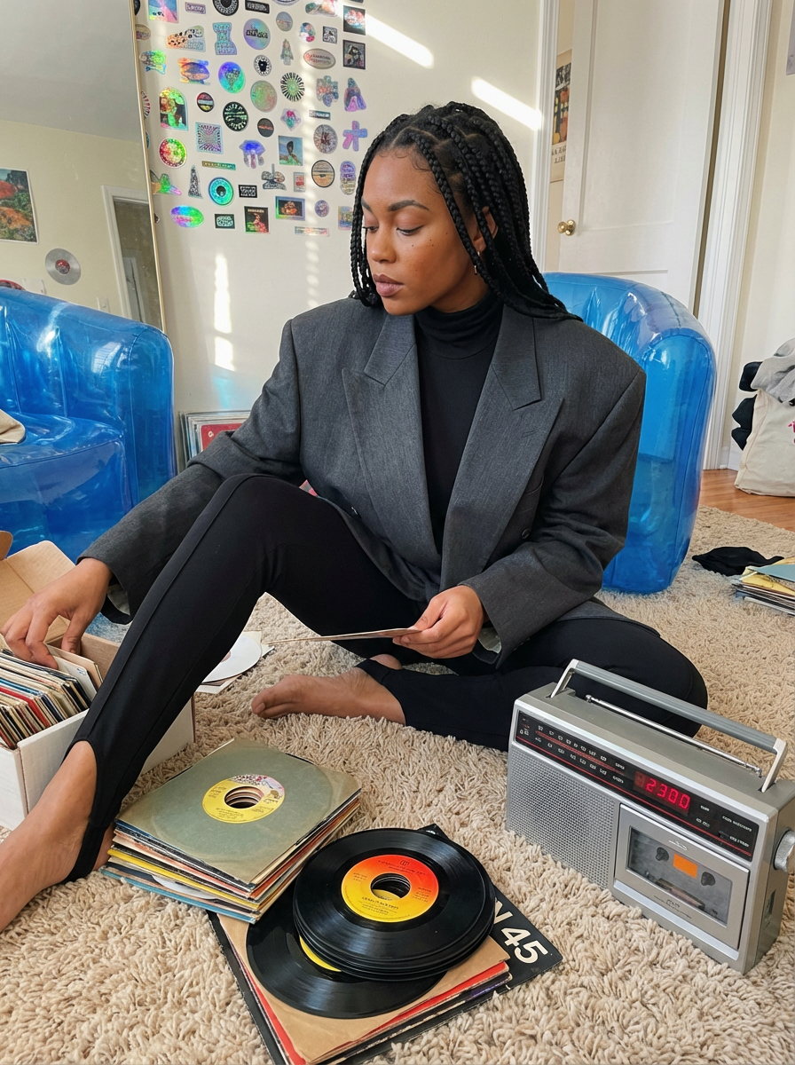 model sitting cross-legged on shag carpet, wearing oversized blazer with massive shoulder pads and stirrup pants , organizing a collection of 45 RPM singles, portable radio with digital display nearby, inflatable furniture and holographic stickers decorating the room