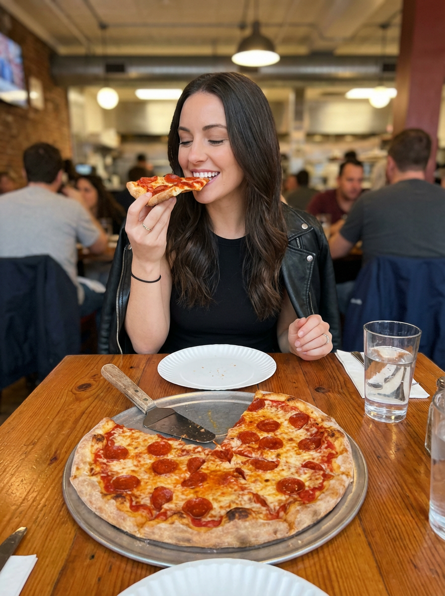 model sitting in a restaurant eating a large pizza