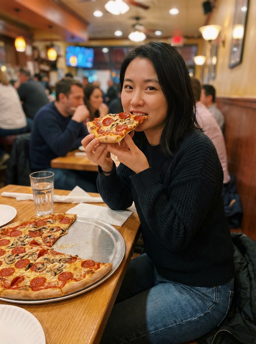 model sitting in a restaurant eating a large pizza