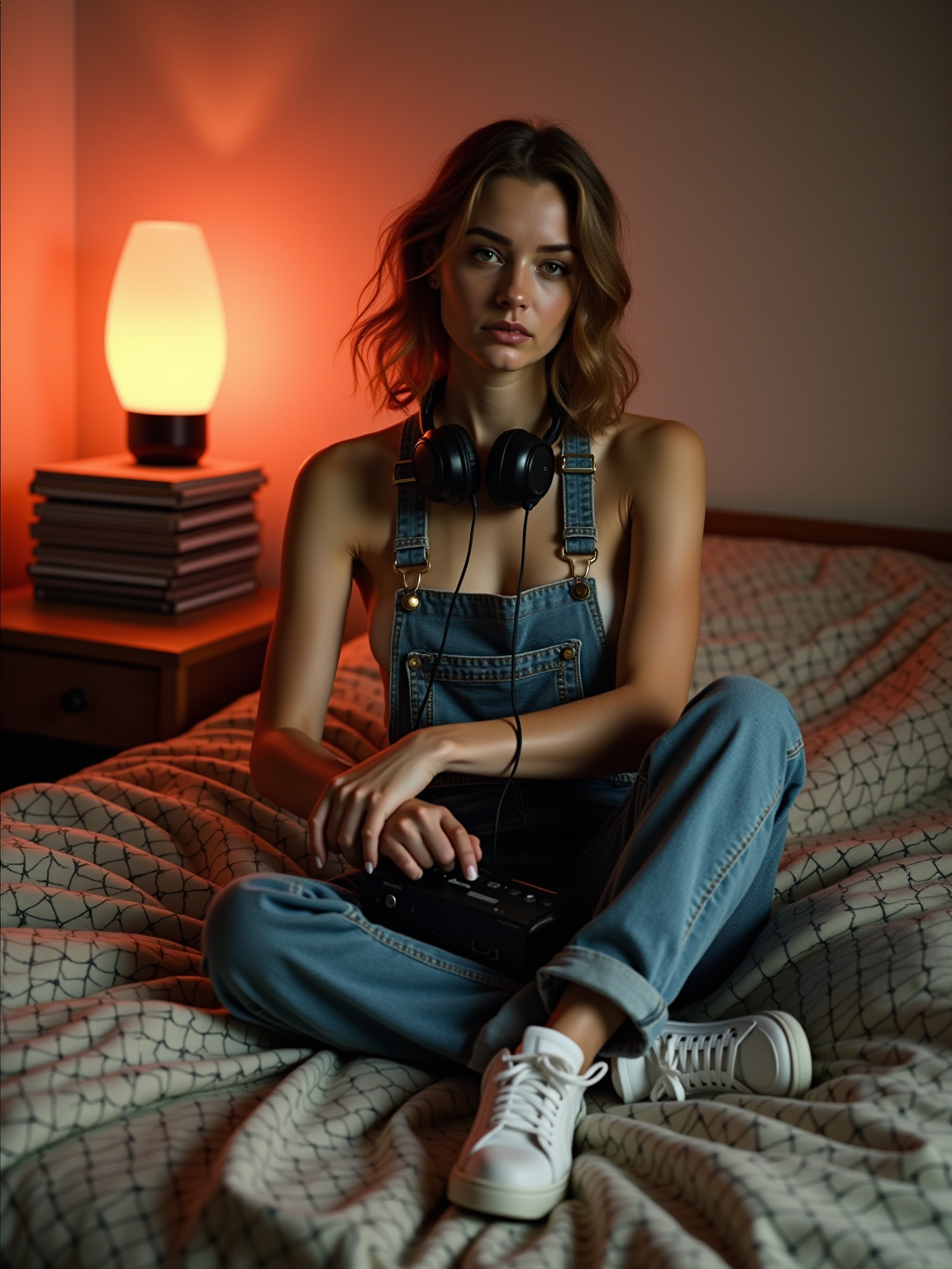 model sitting on a bed covered with a geometric patterned comforter, wearing overalls with one strap undone and chunky sneakers , holding a portable CD player with headphones around neck, stack of CD jewel cases nearby, lava lamp glowing in the corner