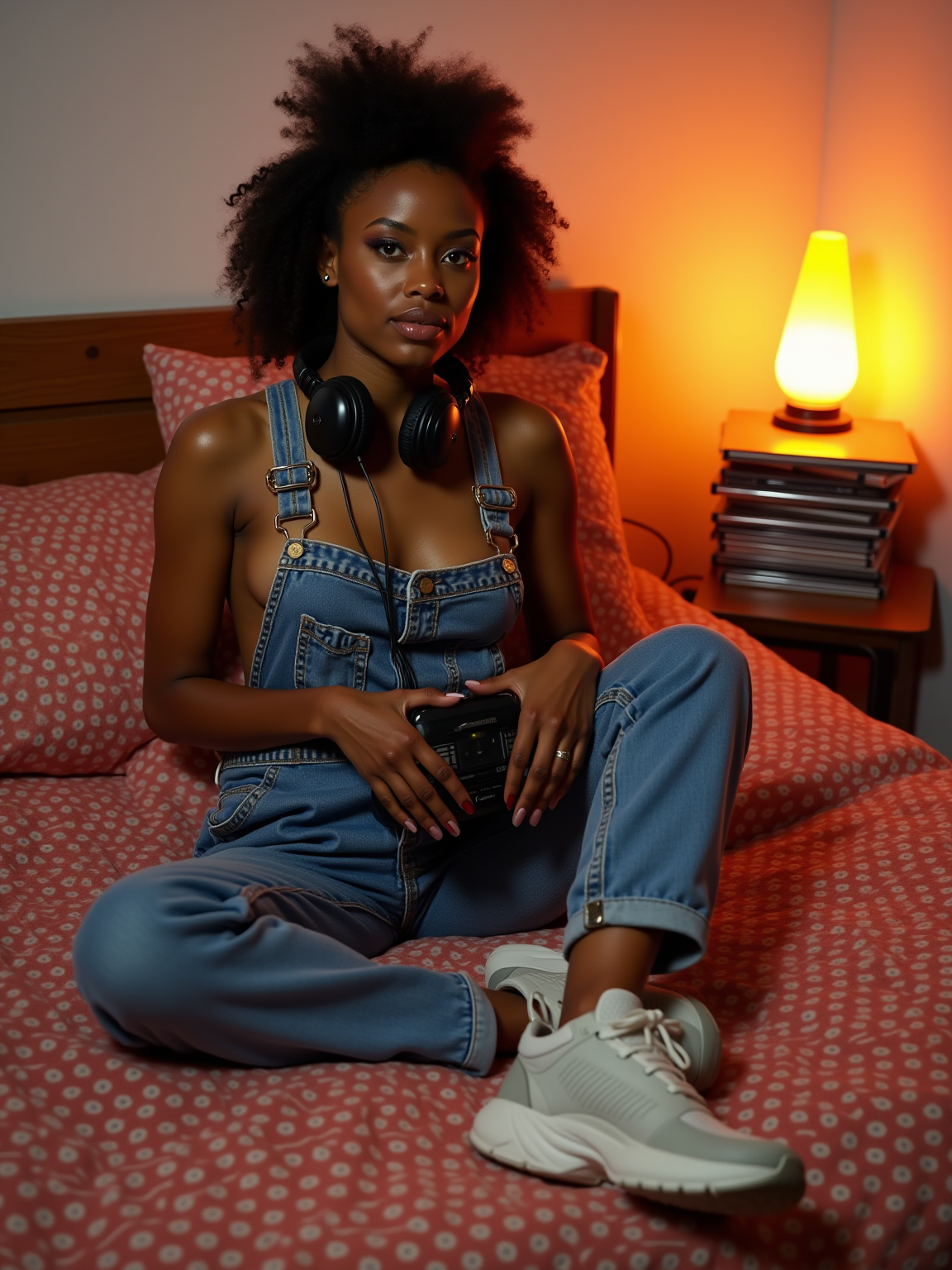 model sitting on a bed covered with a geometric patterned comforter, wearing overalls with one strap undone and chunky sneakers , holding a portable CD player with headphones around neck, stack of CD jewel cases nearby, lava lamp glowing in the corner