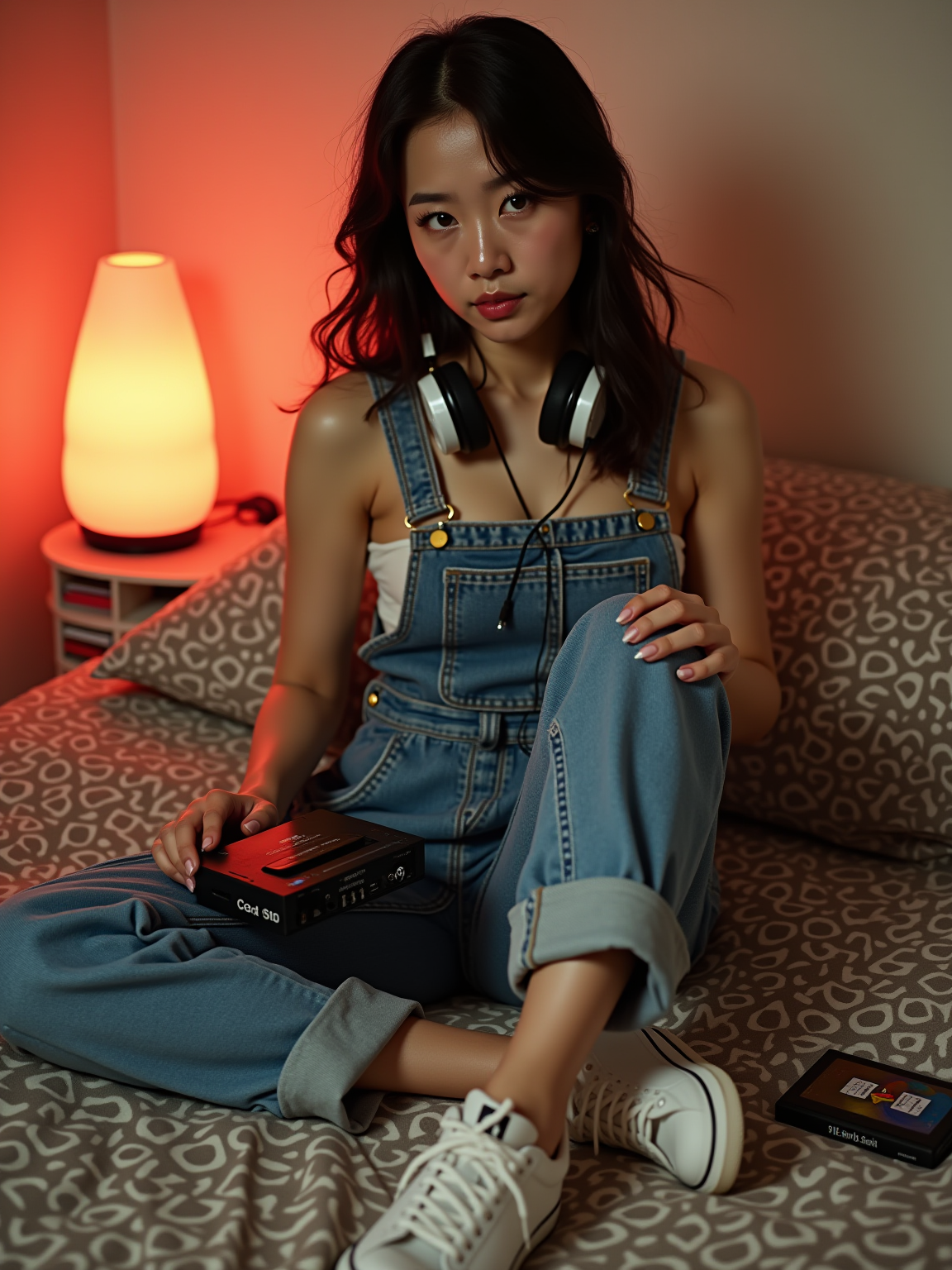 model sitting on a bed covered with a geometric patterned comforter, wearing overalls with one strap undone and chunky sneakers , holding a portable CD player with headphones around neck, stack of CD jewel cases nearby, lava lamp glowing in the corner