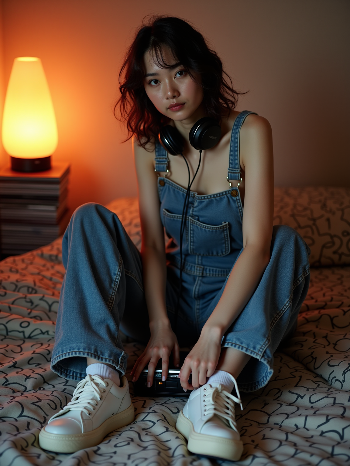 model sitting on a bed covered with a geometric patterned comforter, wearing overalls with one strap undone and chunky sneakers , holding a portable CD player with headphones around neck, stack of CD jewel cases nearby, lava lamp glowing in the corner