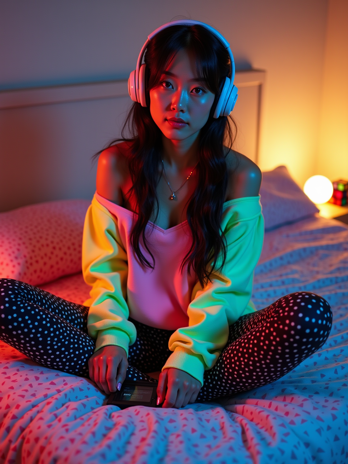 model sitting on a bed covered with geometric neon patterned sheets, wearing off-shoulder sweatshirt with neon colors and spandex leggings , holding a Sony Walkman with foam headphones, stack of cassette tapes nearby, Rubik's cube on nightstand