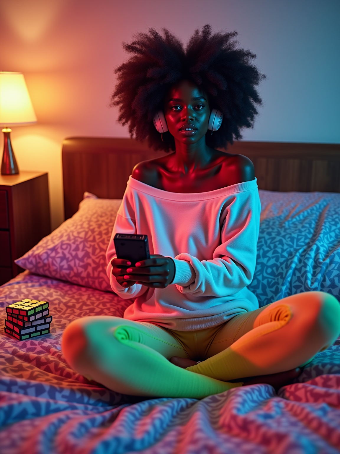 model sitting on a bed covered with geometric neon patterned sheets, wearing off-shoulder sweatshirt with neon colors and spandex leggings , holding a Sony Walkman with foam headphones, stack of cassette tapes nearby, Rubik's cube on nightstand