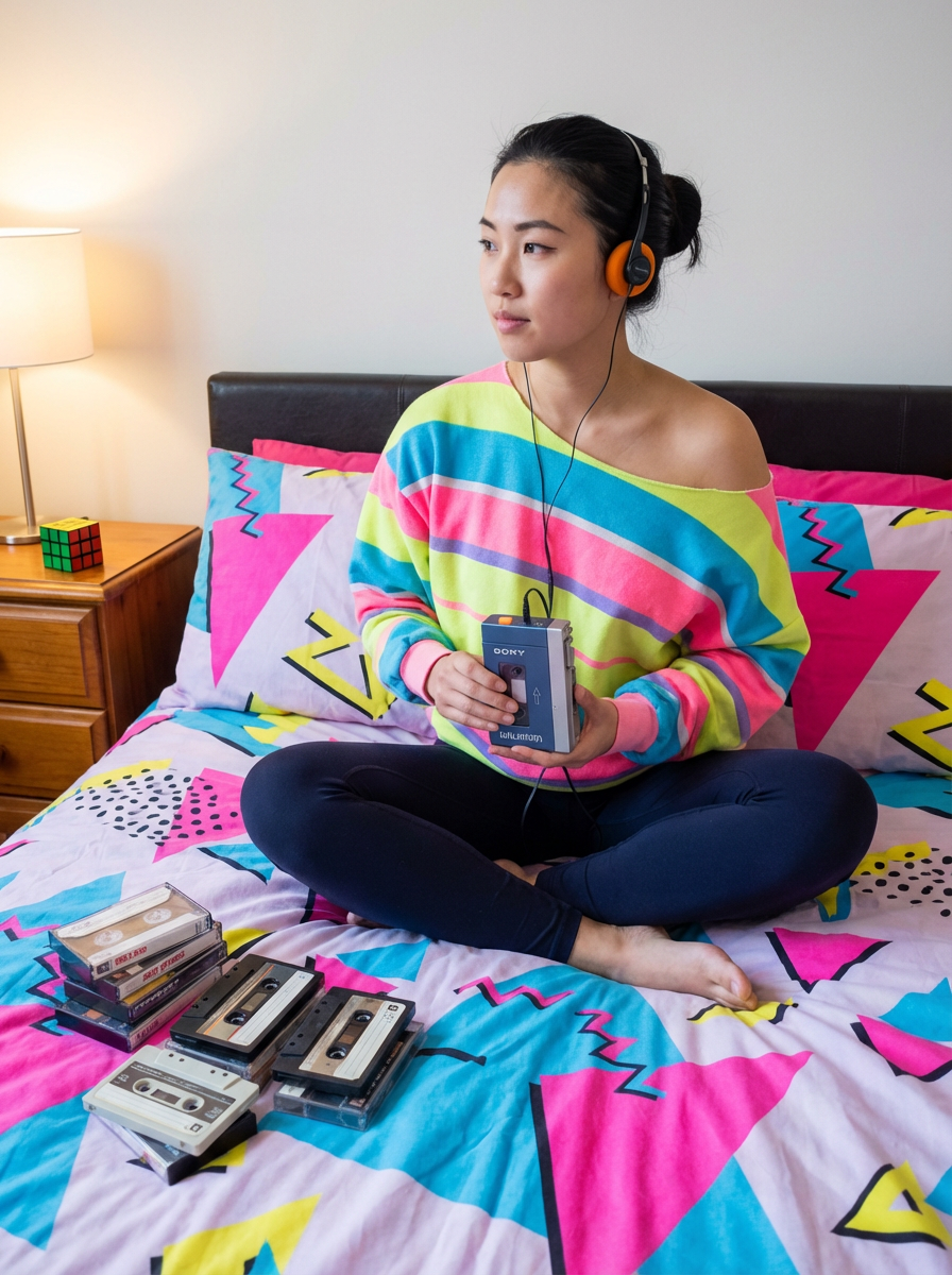 model sitting on a bed covered with geometric neon patterned sheets, wearing off-shoulder sweatshirt with neon colors and spandex leggings , holding a Sony Walkman with foam headphones, stack of cassette tapes nearby, Rubik's cube on nightstand