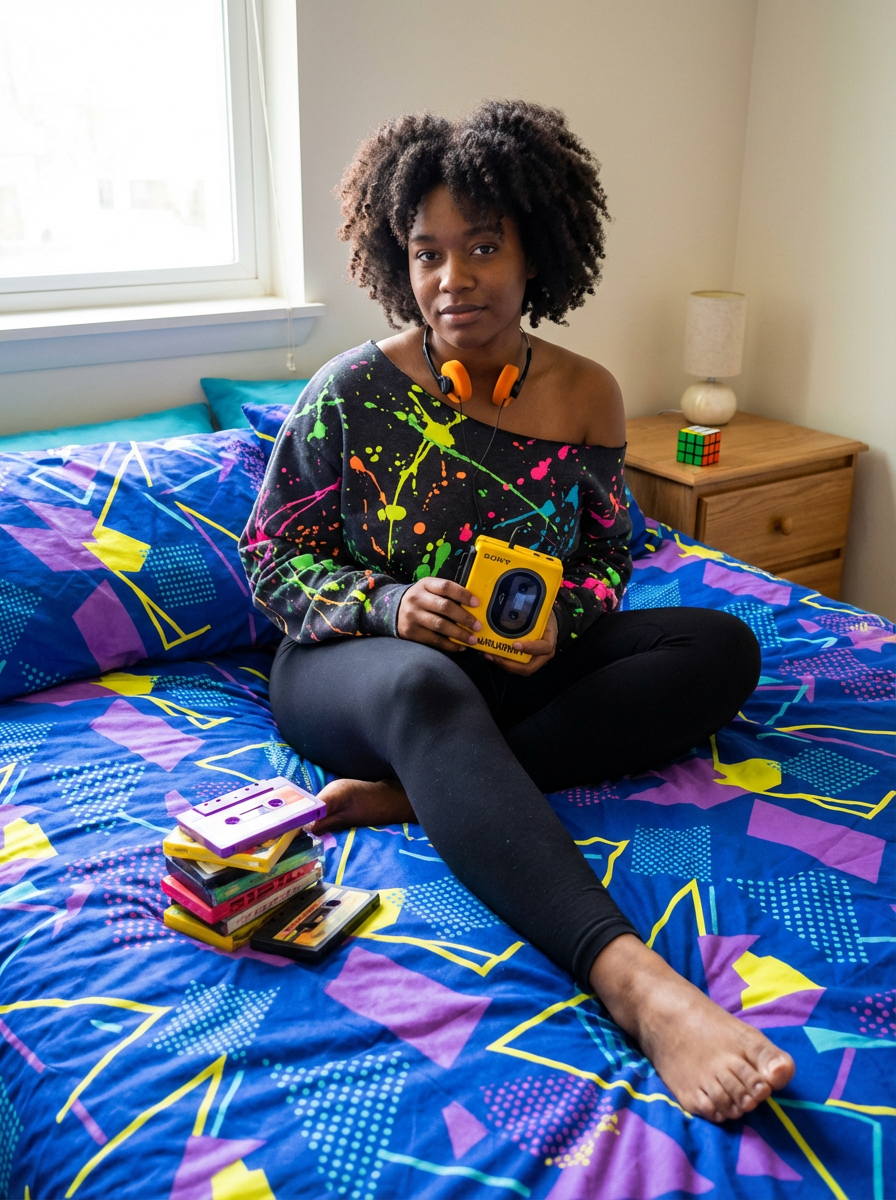 model sitting on a bed covered with geometric neon patterned sheets, wearing off-shoulder sweatshirt with neon colors and spandex leggings , holding a Sony Walkman with foam headphones, stack of cassette tapes nearby, Rubik's cube on nightstand