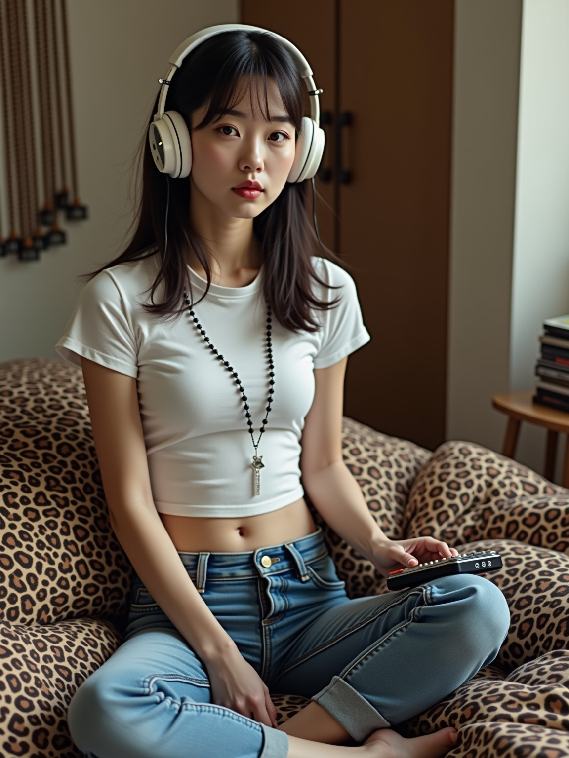 model sitting on a bed covered with inflatable furniture and leopard print bedding, wearing a baby tee with ultra low-rise jeans and belly chain , holding a portable CD player with foam headphones, stack of Now CDs nearby, beaded door curtain hanging in doorway