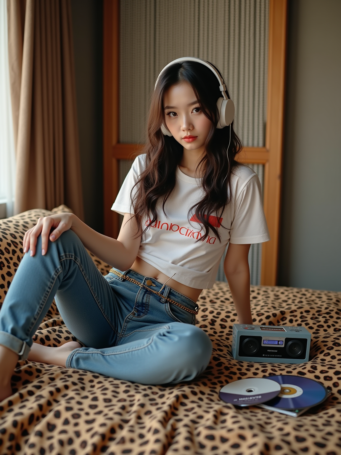 model sitting on a bed covered with inflatable furniture and leopard print bedding, wearing a baby tee with ultra low-rise jeans and belly chain , holding a portable CD player with foam headphones, stack of Now CDs nearby, beaded door curtain hanging in doorway