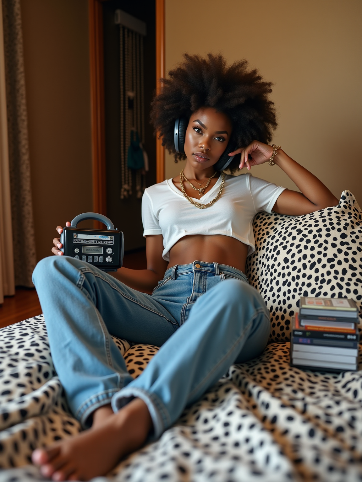 model sitting on a bed covered with inflatable furniture and leopard print bedding, wearing a baby tee with ultra low-rise jeans and belly chain , holding a portable CD player with foam headphones, stack of Now CDs nearby, beaded door curtain hanging in doorway
