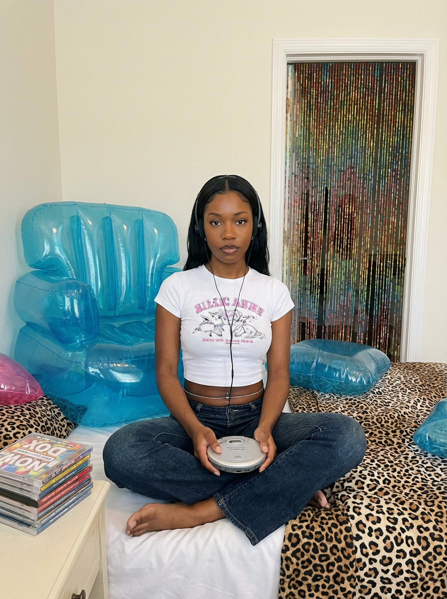 model sitting on a bed covered with inflatable furniture and leopard print bedding, wearing a baby tee with ultra low-rise jeans and belly chain , holding a portable CD player with foam headphones, stack of Now CDs nearby, beaded door curtain hanging in doorway