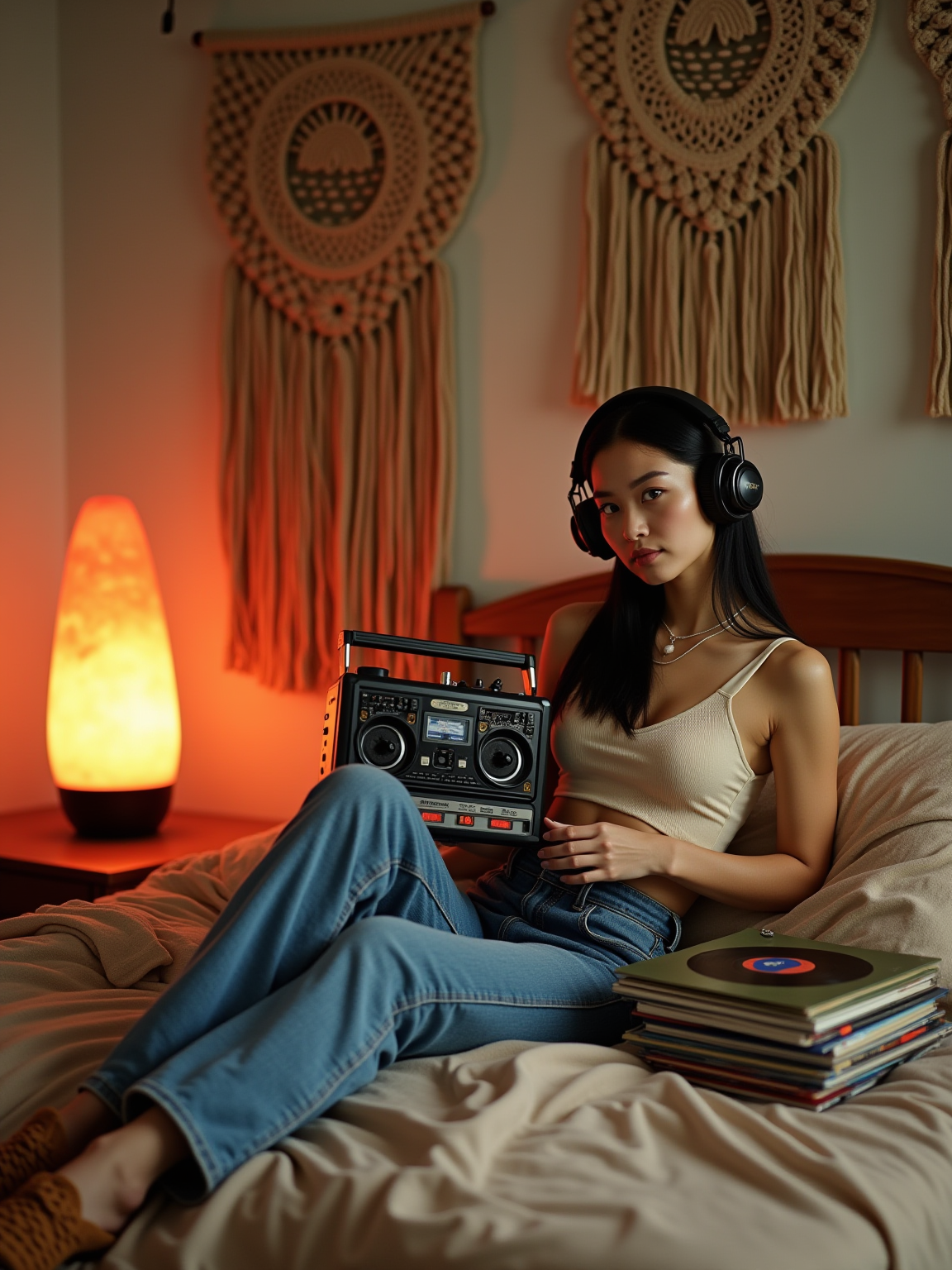 model sitting on a bed covered with macramé wall hangings and earth-tone bedding, wearing a halter top with high-waisted flared jeans and wooden clogs , holding a portable 8-track player with large headphones, stack of vinyl albums nearby, lava lamp bubbling in the corner
