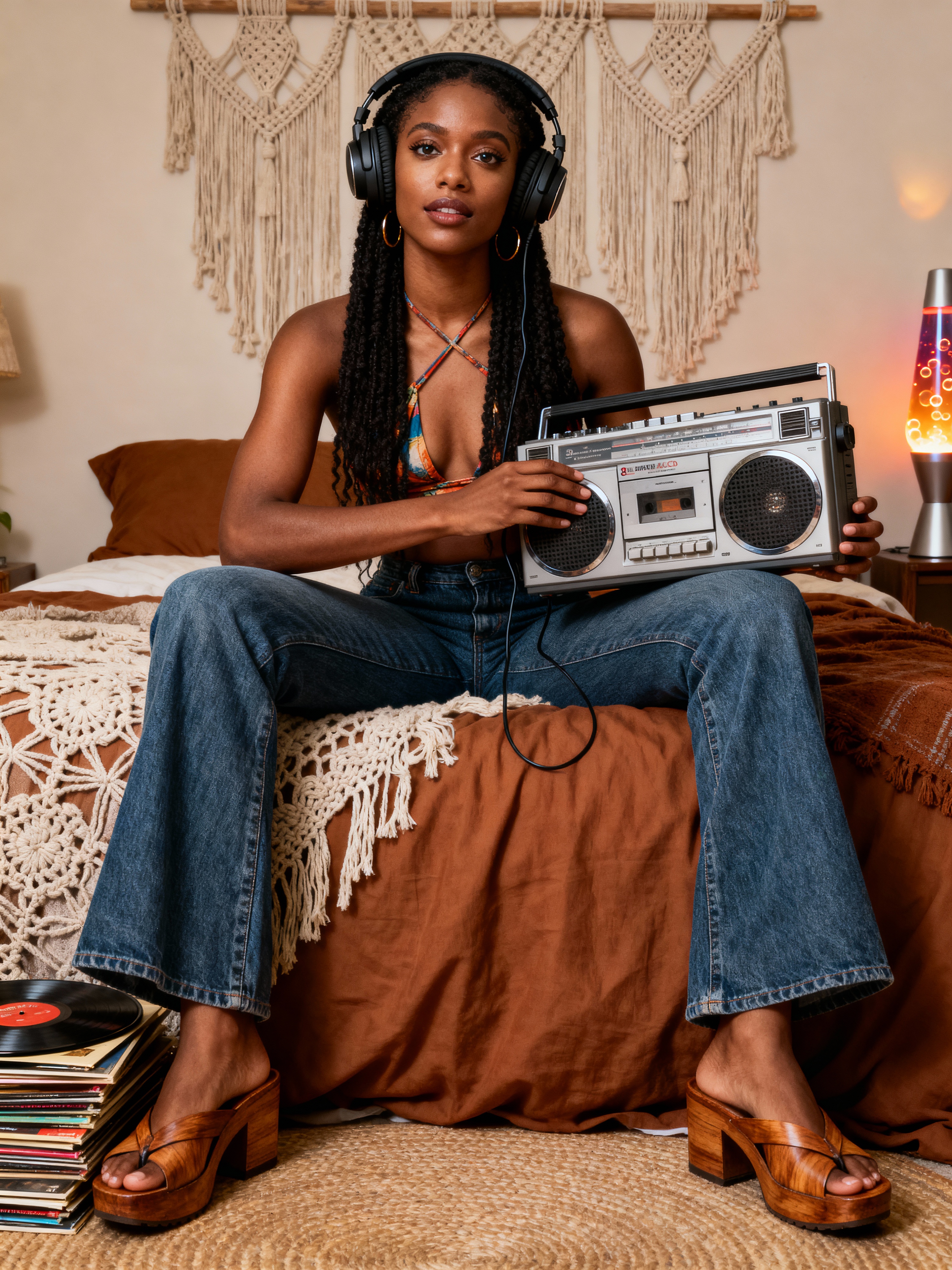 model sitting on a bed covered with macramé wall hangings and earth-tone bedding, wearing a halter top with high-waisted flared jeans and wooden clogs , holding a portable 8-track player with large headphones, stack of vinyl albums nearby, lava lamp bubbling in the corner