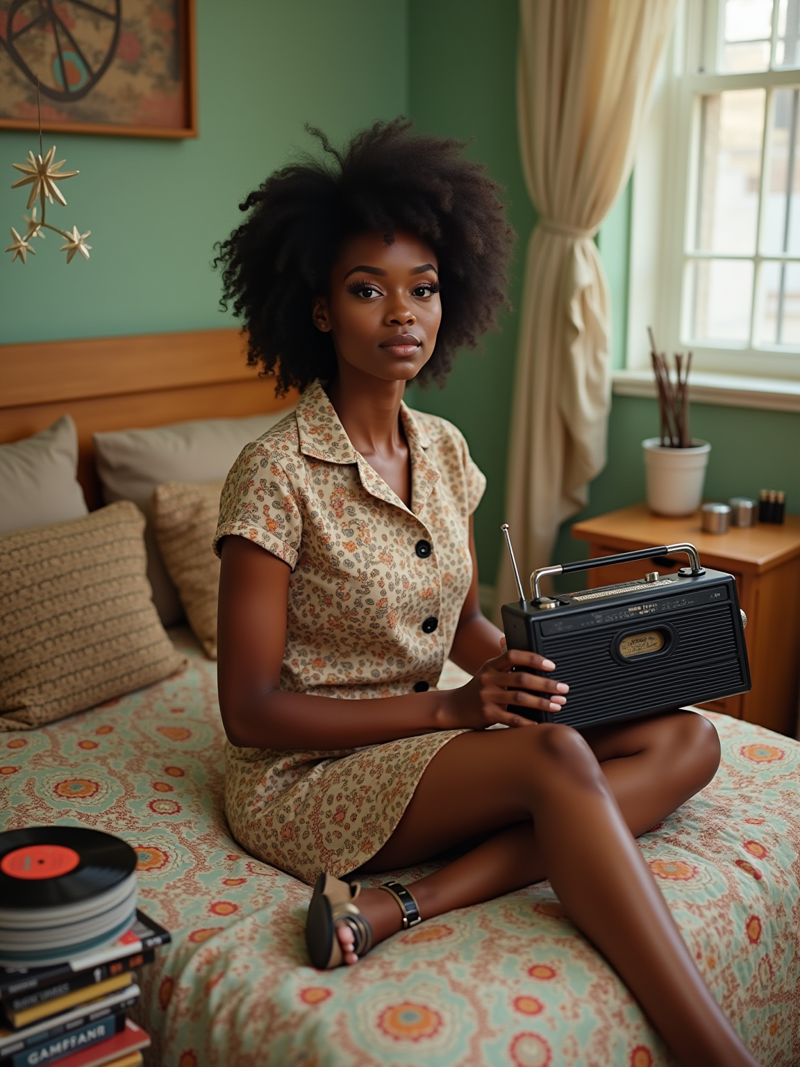 model sitting on a bed covered with paisley print bedding and throw pillows, wearing a shift dress with Peter Pan collar and mary jane shoes , holding a transistor radio with extendable antenna, stack of 45 RPM records nearby, peace sign mobile hanging from ceiling