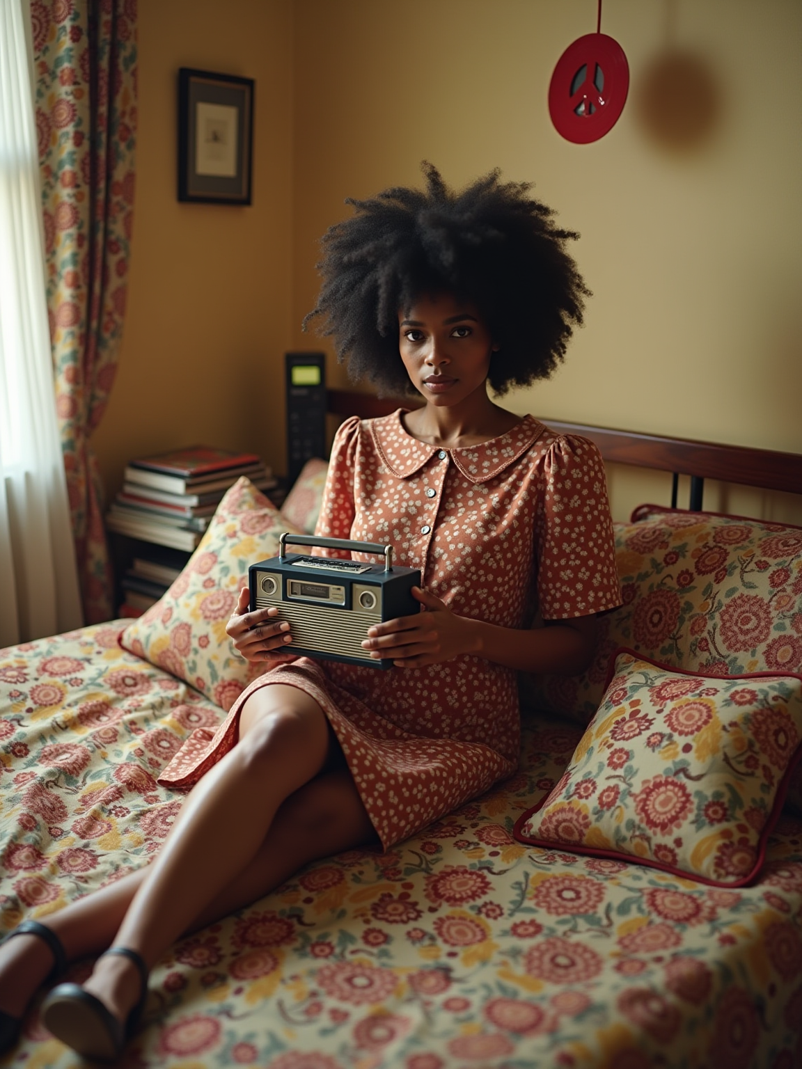 model sitting on a bed covered with paisley print bedding and throw pillows, wearing a shift dress with Peter Pan collar and mary jane shoes , holding a transistor radio with extendable antenna, stack of 45 RPM records nearby, peace sign mobile hanging from ceiling