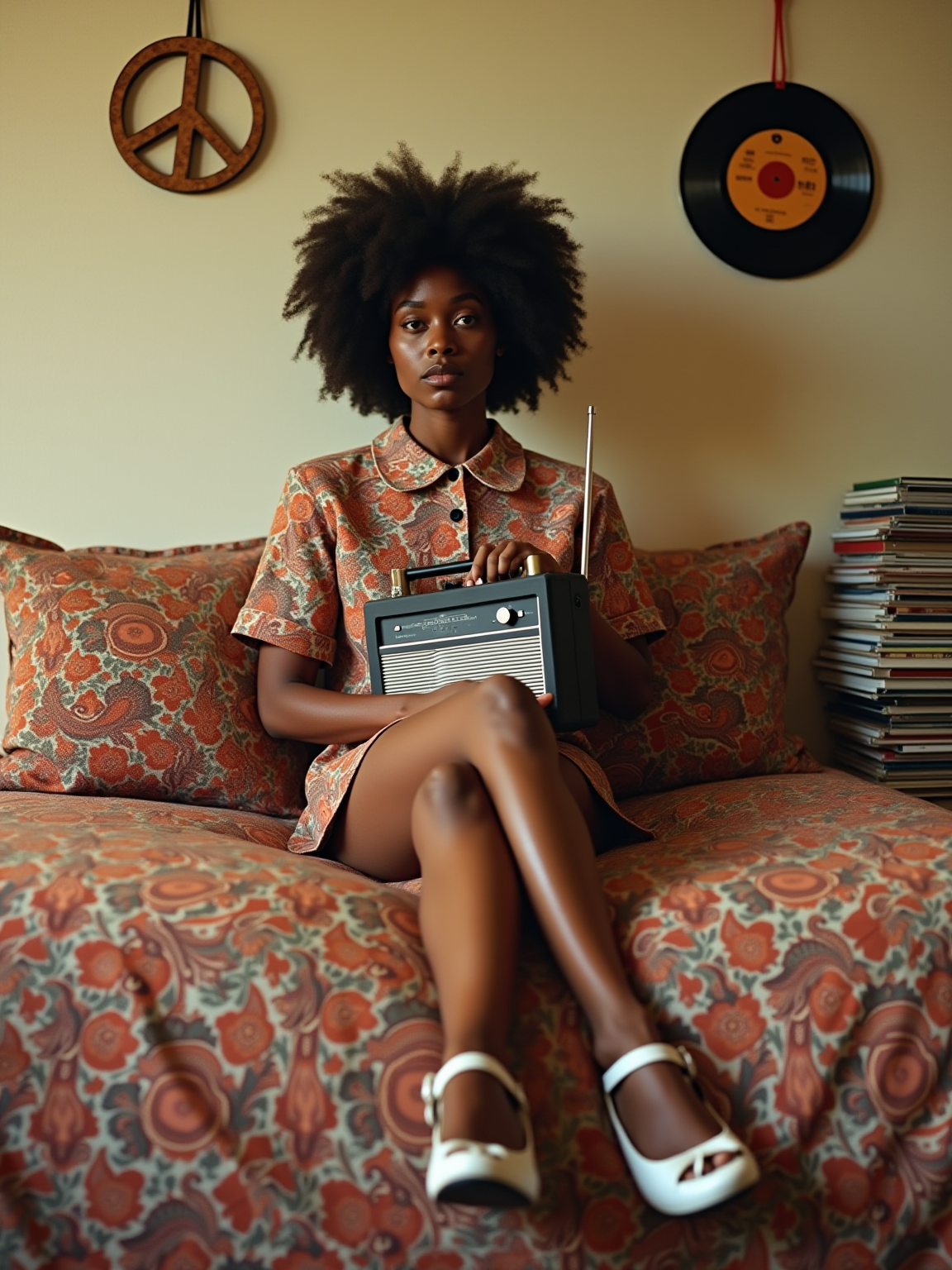 model sitting on a bed covered with paisley print bedding and throw pillows, wearing a shift dress with Peter Pan collar and mary jane shoes , holding a transistor radio with extendable antenna, stack of 45 RPM records nearby, peace sign mobile hanging from ceiling