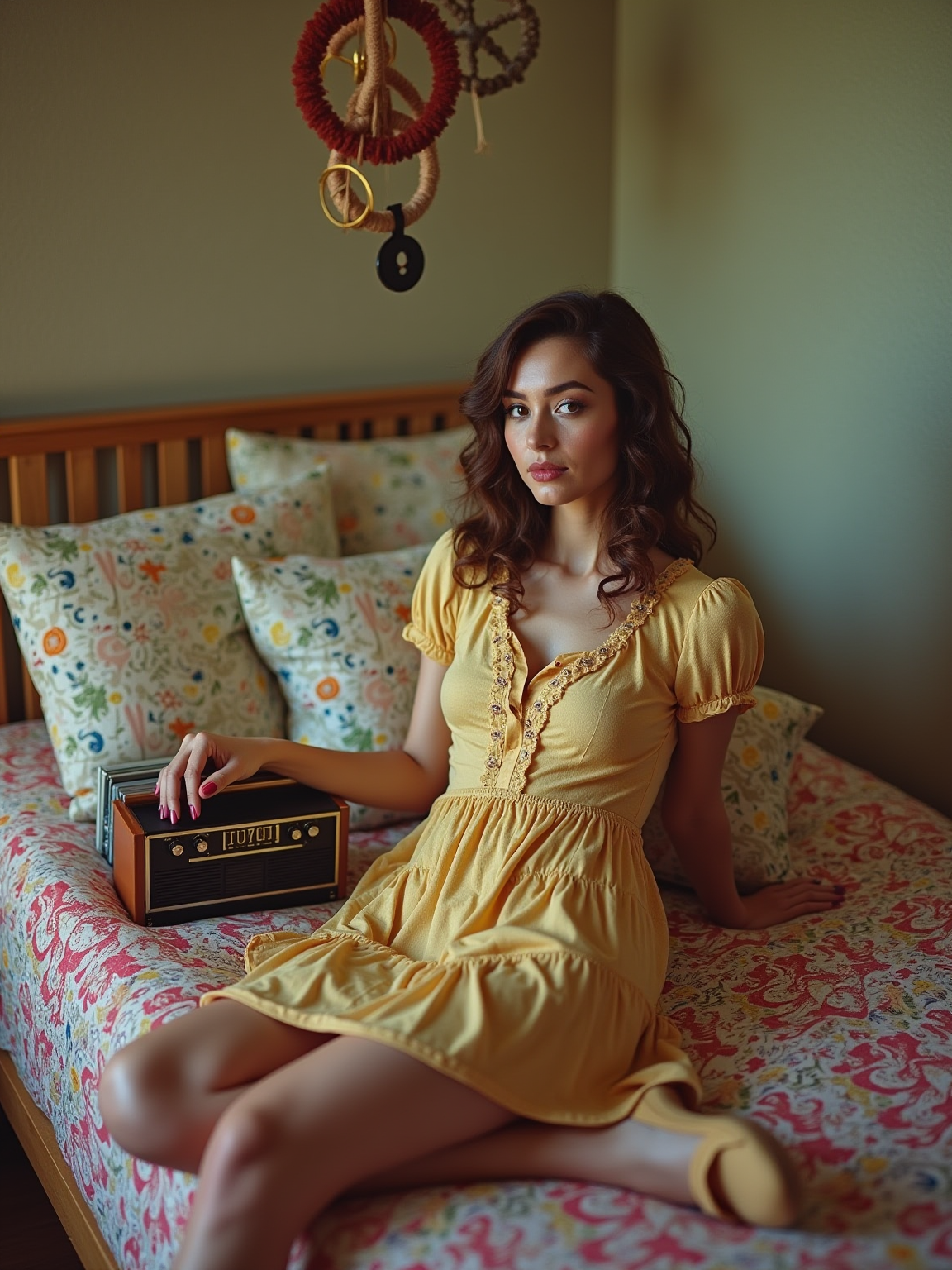 model sitting on a bed covered with paisley print bedding and throw pillows, wearing a shift dress with Peter Pan collar and mary jane shoes , holding a transistor radio with extendable antenna, stack of 45 RPM records nearby, peace sign mobile hanging from ceiling