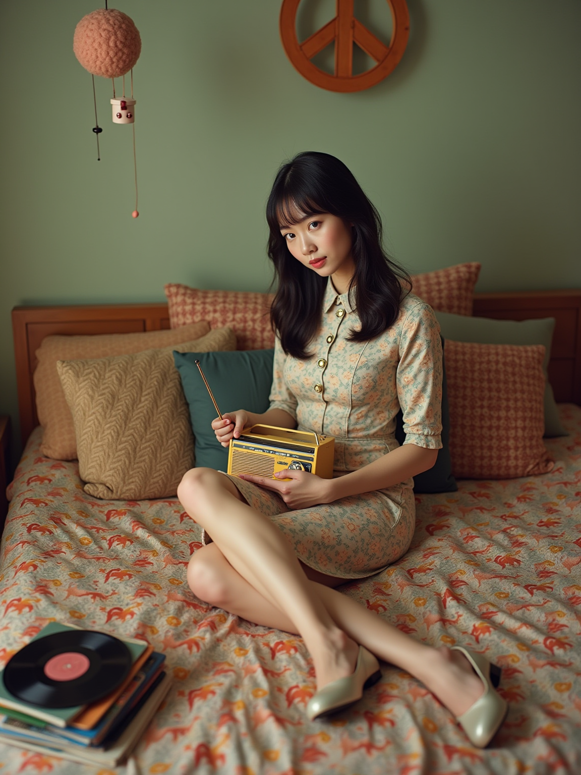 model sitting on a bed covered with paisley print bedding and throw pillows, wearing a shift dress with Peter Pan collar and mary jane shoes , holding a transistor radio with extendable antenna, stack of 45 RPM records nearby, peace sign mobile hanging from ceiling