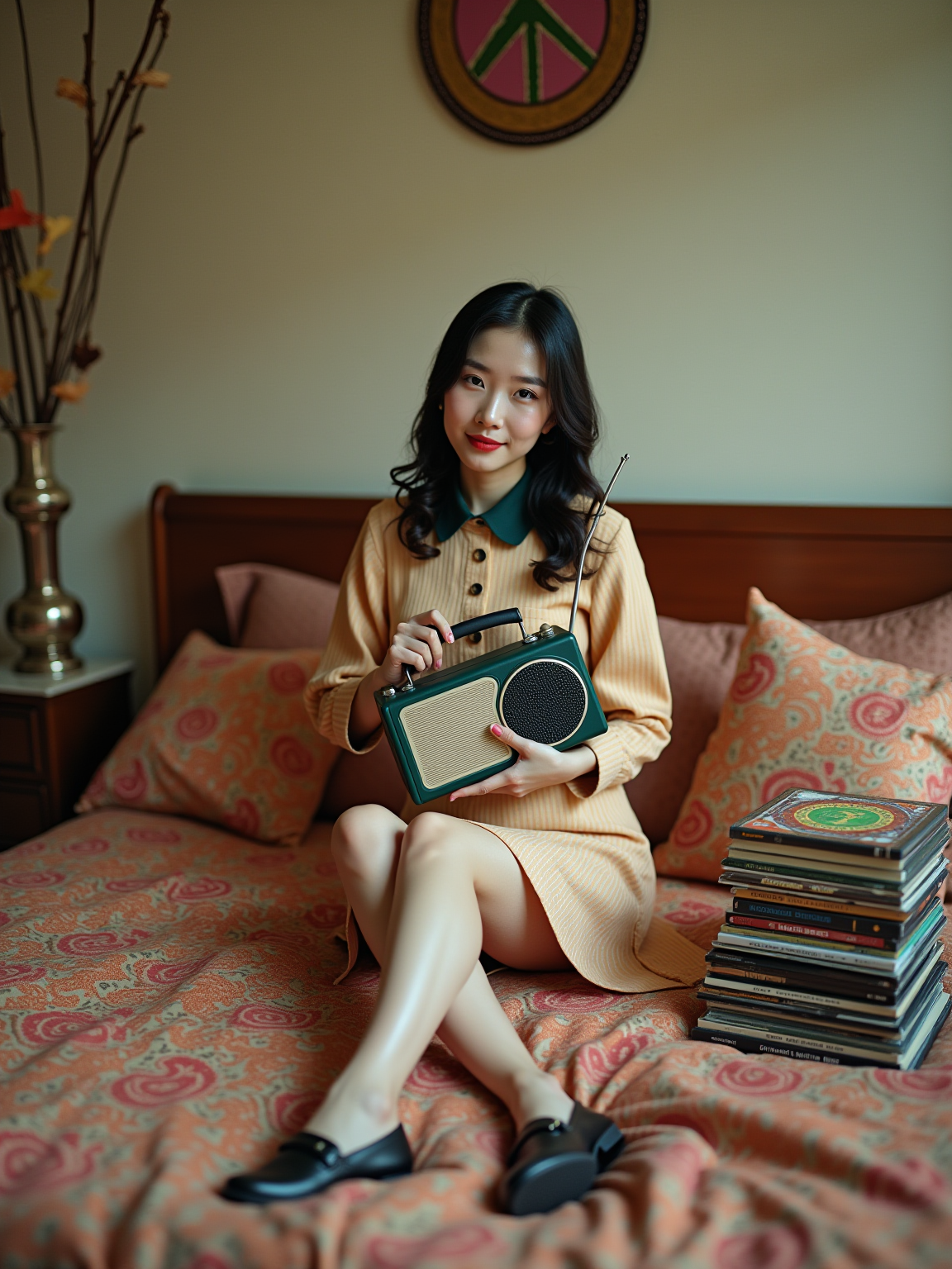 model sitting on a bed covered with paisley print bedding and throw pillows, wearing a shift dress with Peter Pan collar and mary jane shoes , holding a transistor radio with extendable antenna, stack of 45 RPM records nearby, peace sign mobile hanging from ceiling