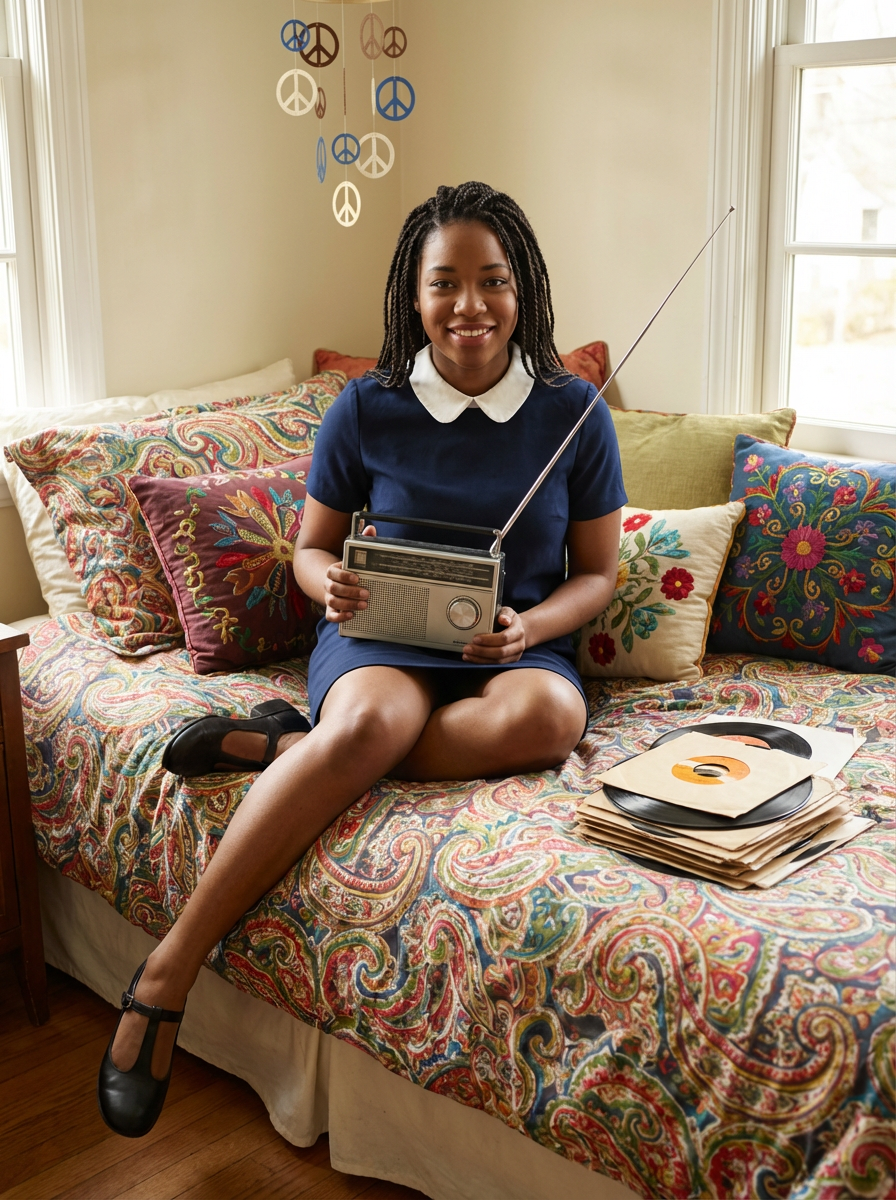 model sitting on a bed covered with paisley print bedding and throw pillows, wearing a shift dress with Peter Pan collar and mary jane shoes , holding a transistor radio with extendable antenna, stack of 45 RPM records nearby, peace sign mobile hanging from ceiling