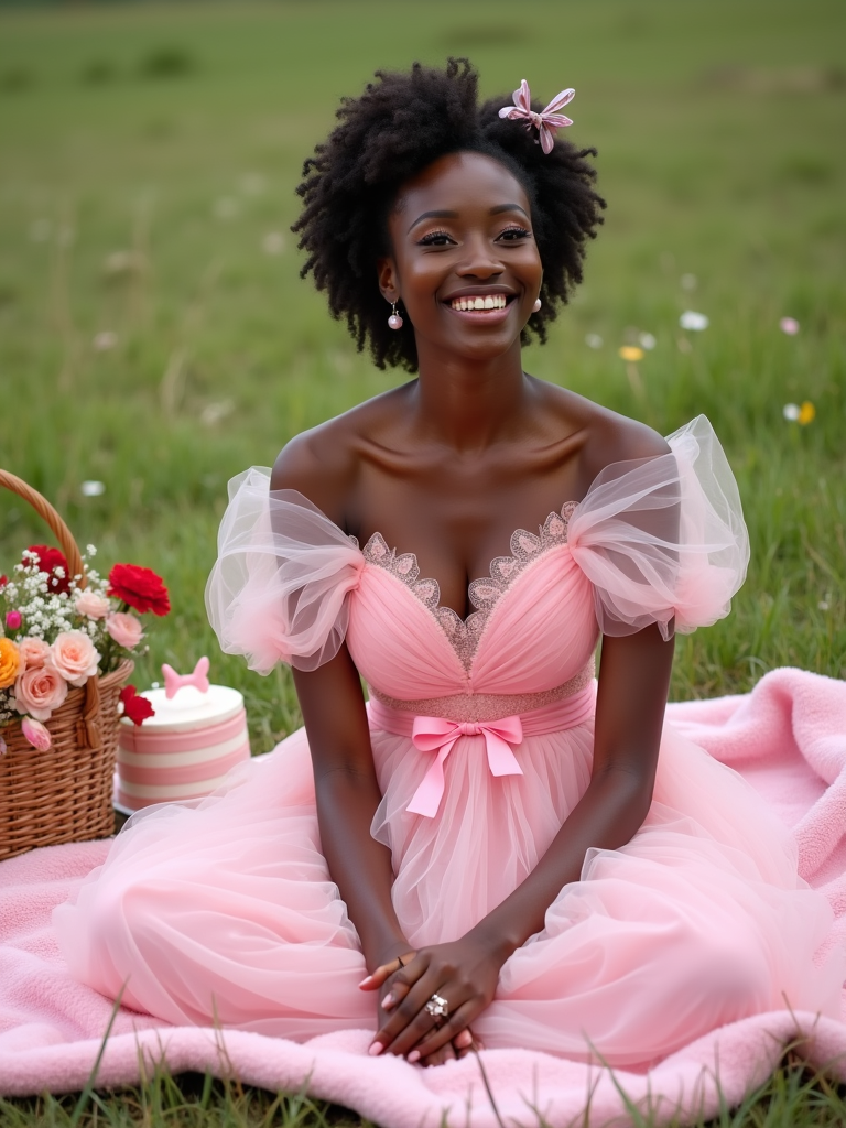 model sitting on a pink blanket in a grassy field, wearing a pink tulle birthday dress with puff sleeves and bow , surrounded by cake, flowers, and picnic baskets