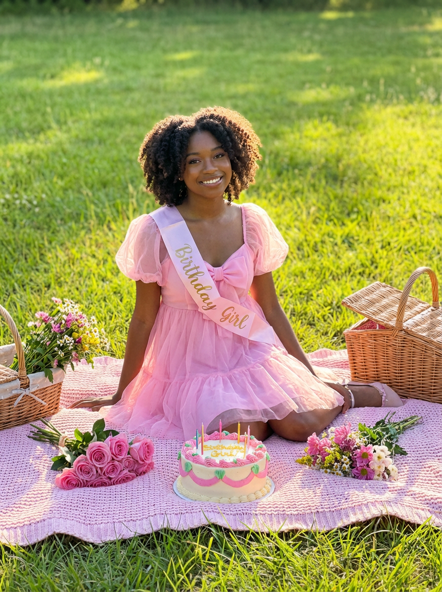 model sitting on a pink blanket in a grassy field, wearing a pink tulle birthday dress with puff sleeves and bow , surrounded by cake, flowers, and picnic baskets
