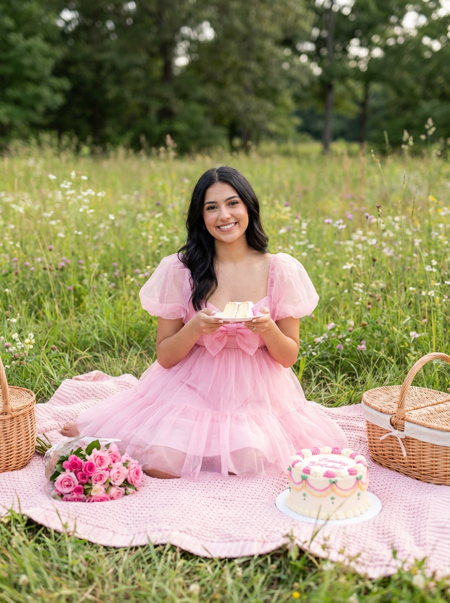 model sitting on a pink blanket in a grassy field, wearing a pink tulle birthday dress with puff sleeves and bow , surrounded by cake, flowers, and picnic baskets