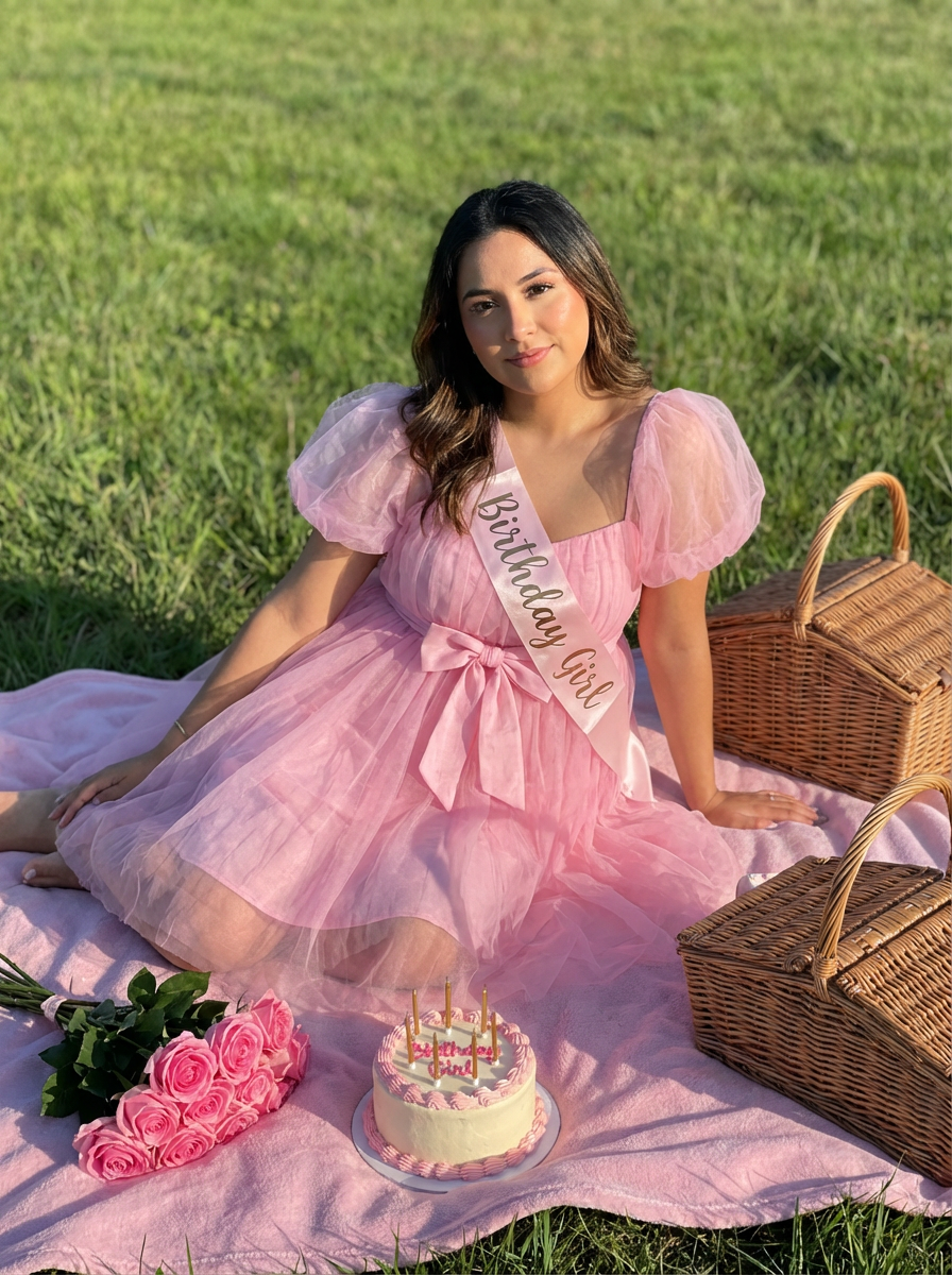model sitting on a pink blanket in a grassy field, wearing a pink tulle birthday dress with puff sleeves and bow , surrounded by cake, flowers, and picnic baskets