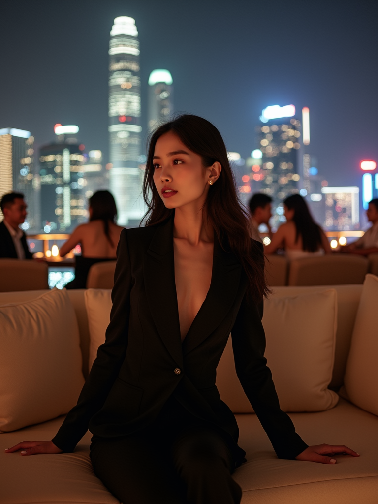 model sitting on an elegant outdoor couch in a luxurious setting. model is wearing a stylish black outfit. The backdrop features a stunning city skyline at night, with brightly lit skyscrapers creating a sophisticated ambiance. The scene suggests an upscale lounge or rooftop setting, with ambient lighting and other patrons visible in the background. The overall vibe is relaxed yet classy, emphasizing luxury and exclusivity.