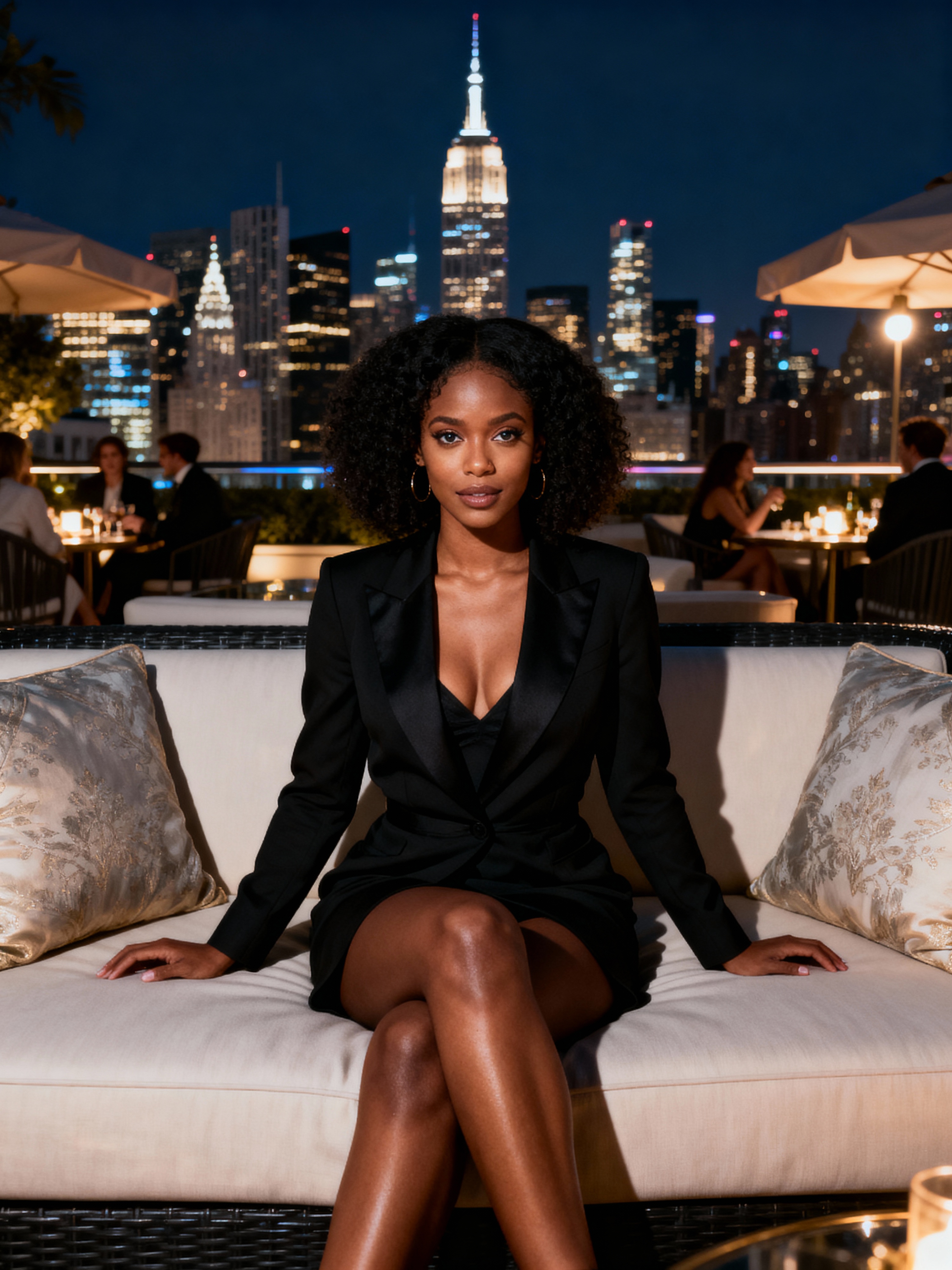 model sitting on an elegant outdoor couch in a luxurious setting. model is wearing a stylish black outfit. The backdrop features a stunning city skyline at night, with brightly lit skyscrapers creating a sophisticated ambiance. The scene suggests an upscale lounge or rooftop setting, with ambient lighting and other patrons visible in the background. The overall vibe is relaxed yet classy, emphasizing luxury and exclusivity.