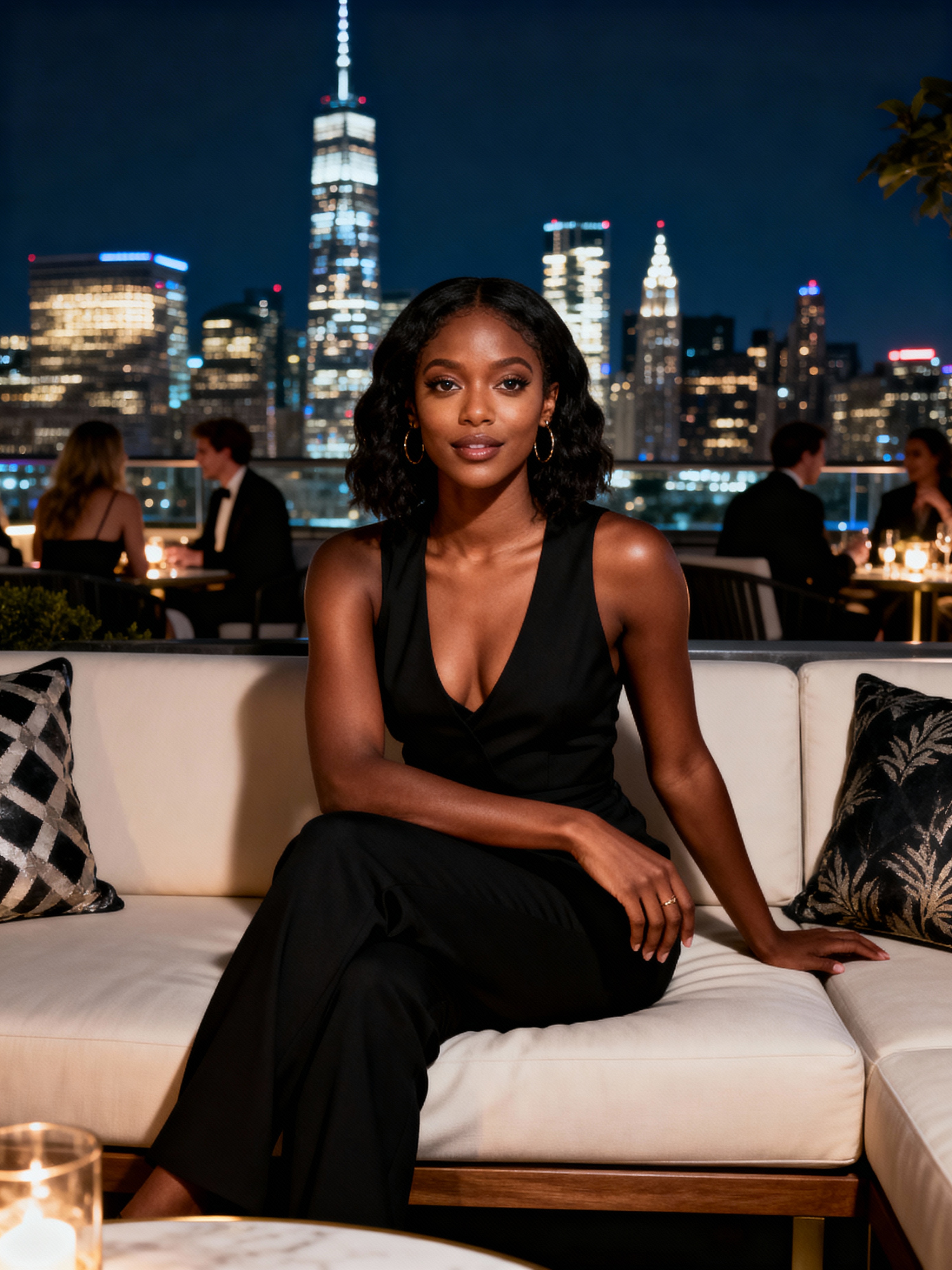 model sitting on an elegant outdoor couch in a luxurious setting. model is wearing a stylish black outfit. The backdrop features a stunning city skyline at night, with brightly lit skyscrapers creating a sophisticated ambiance. The scene suggests an upscale lounge or rooftop setting, with ambient lighting and other patrons visible in the background. The overall vibe is relaxed yet classy, emphasizing luxury and exclusivity.