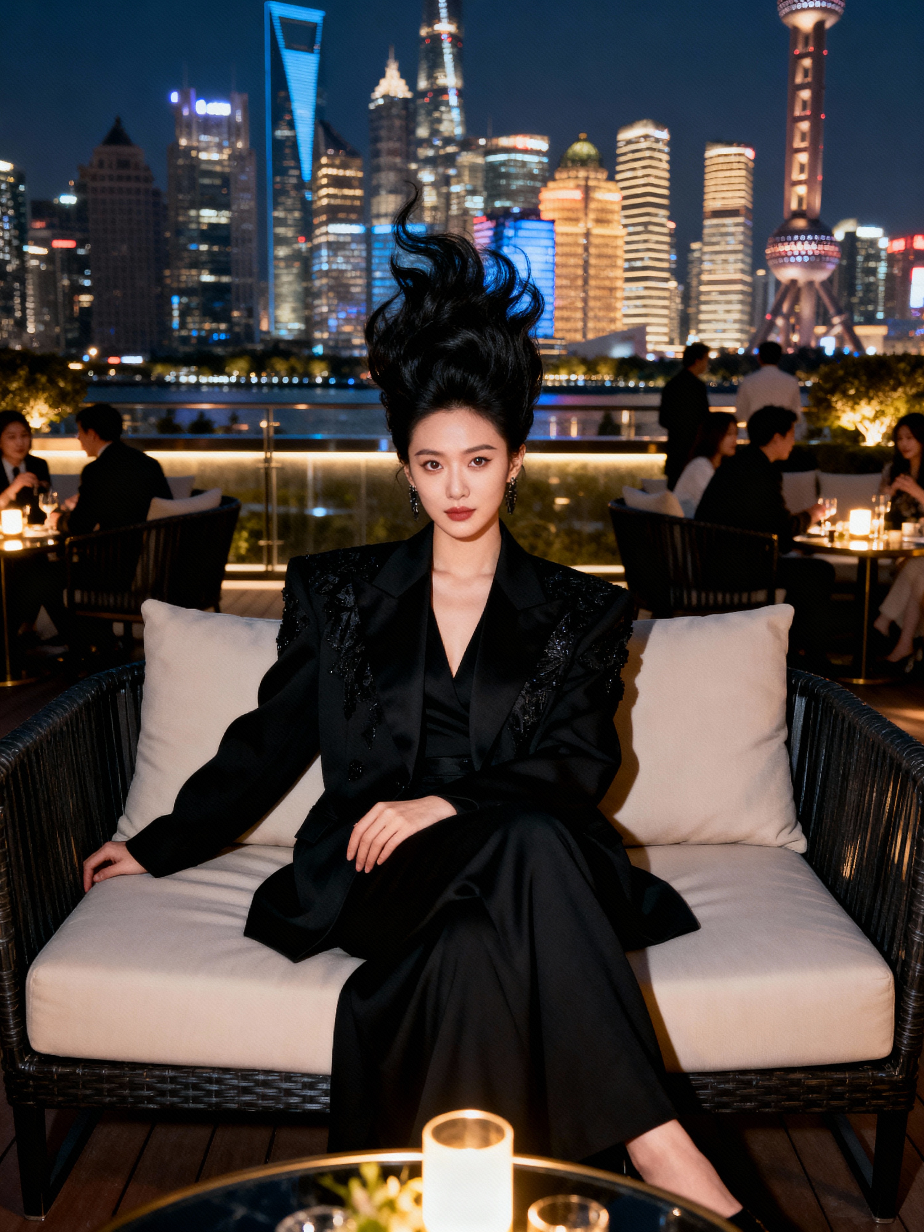 model sitting on an elegant outdoor couch in a luxurious setting. model is wearing a stylish black outfit. The backdrop features a stunning city skyline at night, with brightly lit skyscrapers creating a sophisticated ambiance. The scene suggests an upscale lounge or rooftop setting, with ambient lighting and other patrons visible in the background. The overall vibe is relaxed yet classy, emphasizing luxury and exclusivity.