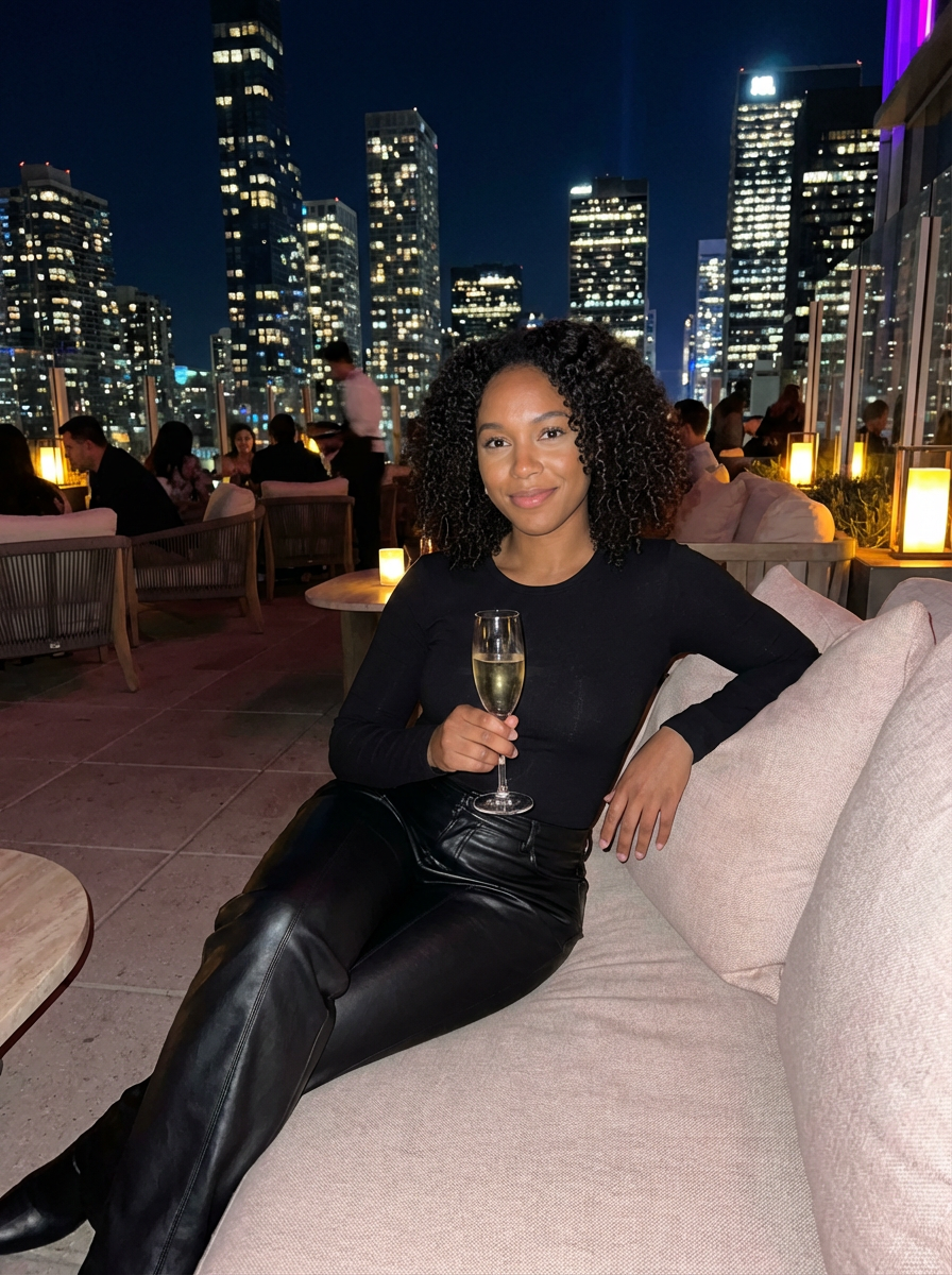 model sitting on an elegant outdoor couch in a luxurious setting. model is wearing a stylish black outfit. The backdrop features a stunning city skyline at night, with brightly lit skyscrapers creating a sophisticated ambiance. The scene suggests an upscale lounge or rooftop setting, with ambient lighting and other patrons visible in the background. The overall vibe is relaxed yet classy, emphasizing luxury and exclusivity.