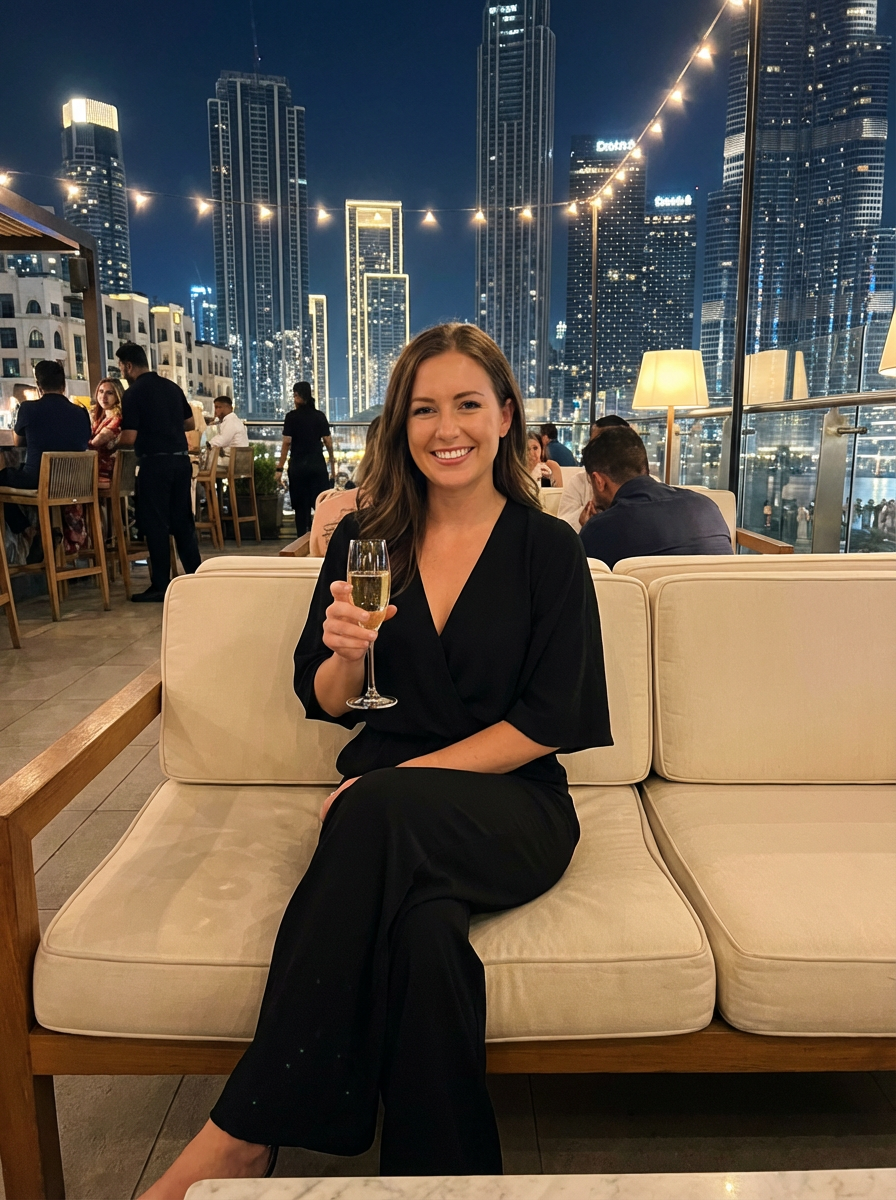 model sitting on an elegant outdoor couch in a luxurious setting. model is wearing a stylish black outfit. The backdrop features a stunning city skyline at night, with brightly lit skyscrapers creating a sophisticated ambiance. The scene suggests an upscale lounge or rooftop setting, with ambient lighting and other patrons visible in the background. The overall vibe is relaxed yet classy, emphasizing luxury and exclusivity.