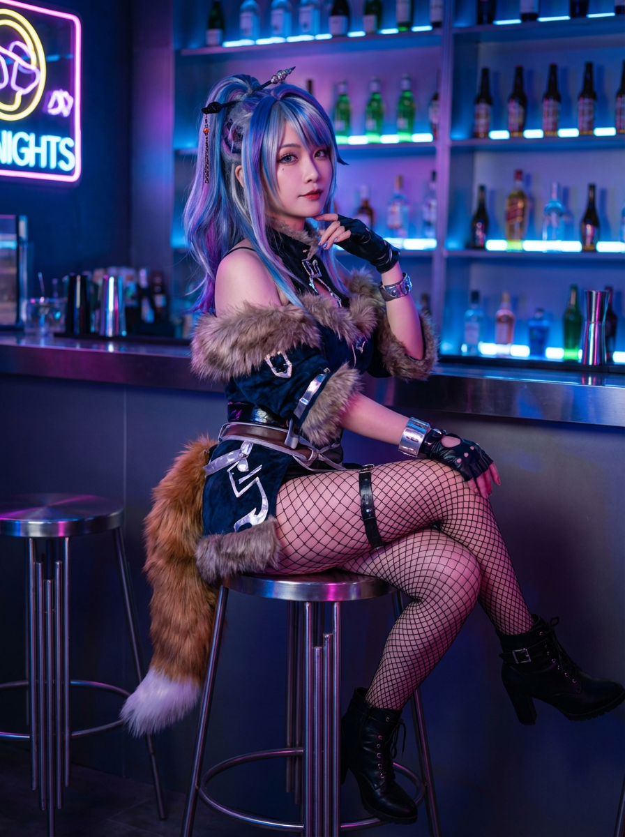 model sitting on bar stool. she is wearing cosplay-themed, revealing outfits that include elements like fishnet stockings, fur, fox tails, and various accessories. the setting appears to be a futuristic or fantastical bar, with vibrant colors and neon lights in the background. she has beautiful hair colors and styles, and she is posed in a way that emphasizes their perfect body shapes,