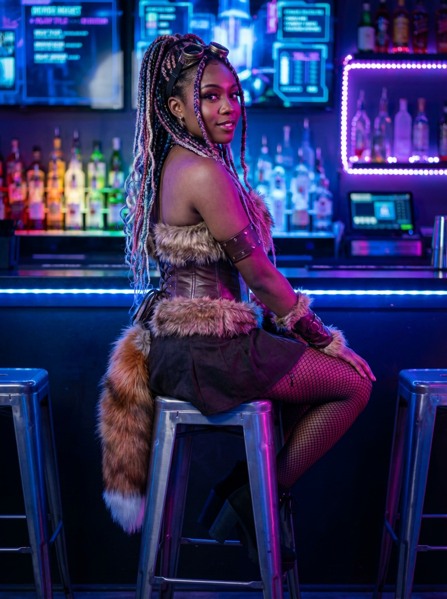 model sitting on bar stool. she is wearing cosplay-themed, revealing outfits that include elements like fishnet stockings, fur, fox tails, and various accessories. the setting appears to be a futuristic or fantastical bar, with vibrant colors and neon lights in the background. she has beautiful hair colors and styles, and she is posed in a way that emphasizes their perfect body shapes,