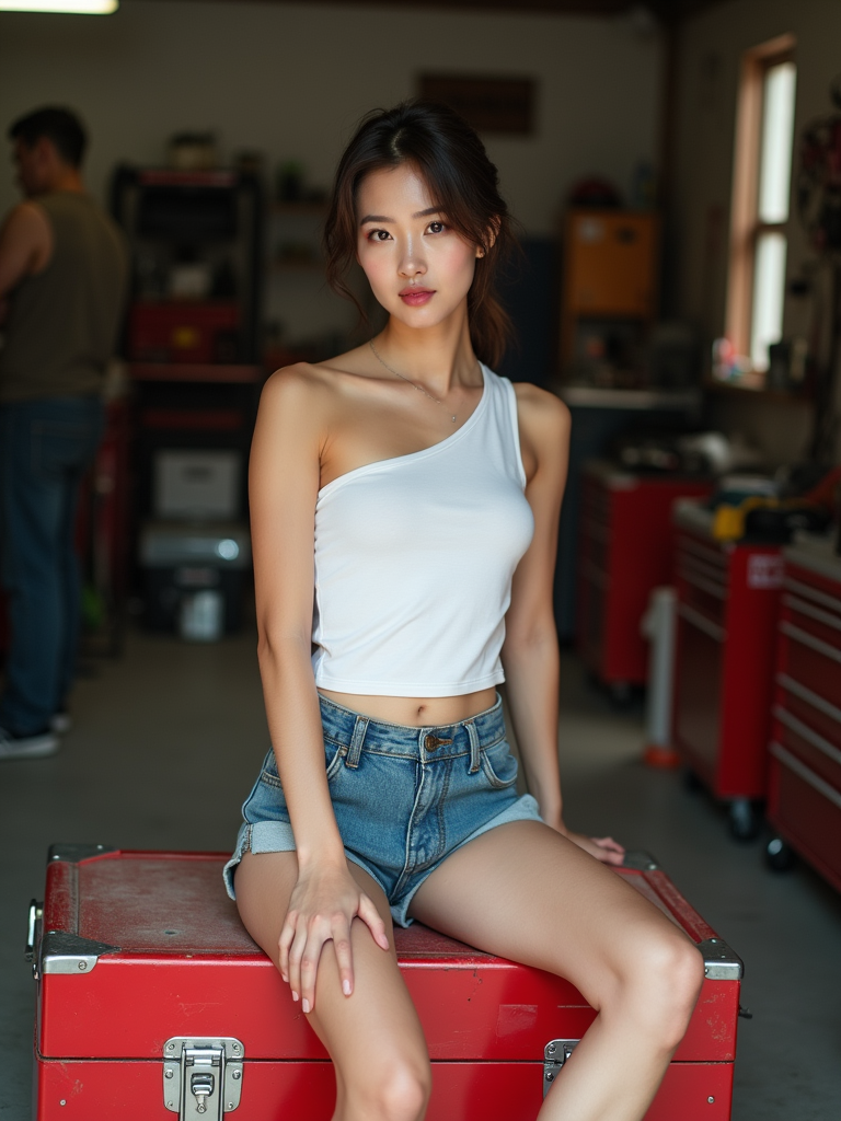model sitting with legs apart on a toolbox, in white tank top falling off one shoulder, visible bra, tiny denim shorts , in a garage setting