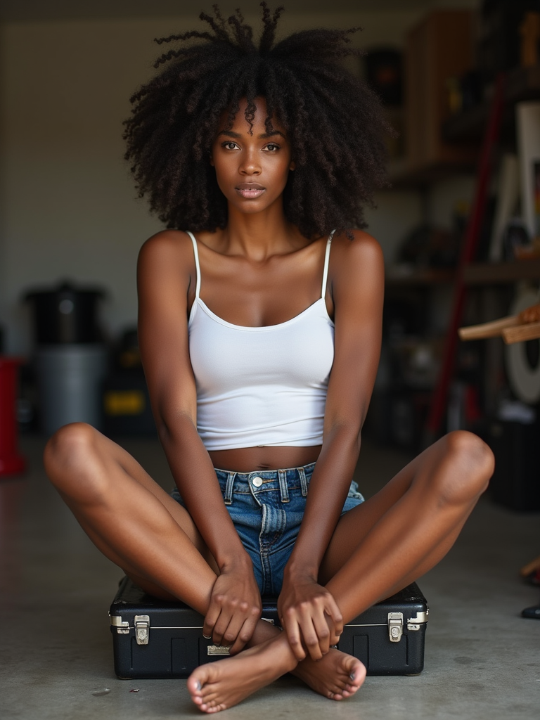 model sitting with legs apart on a toolbox, in white tank top falling off one shoulder, visible bra, tiny denim shorts , in a garage setting