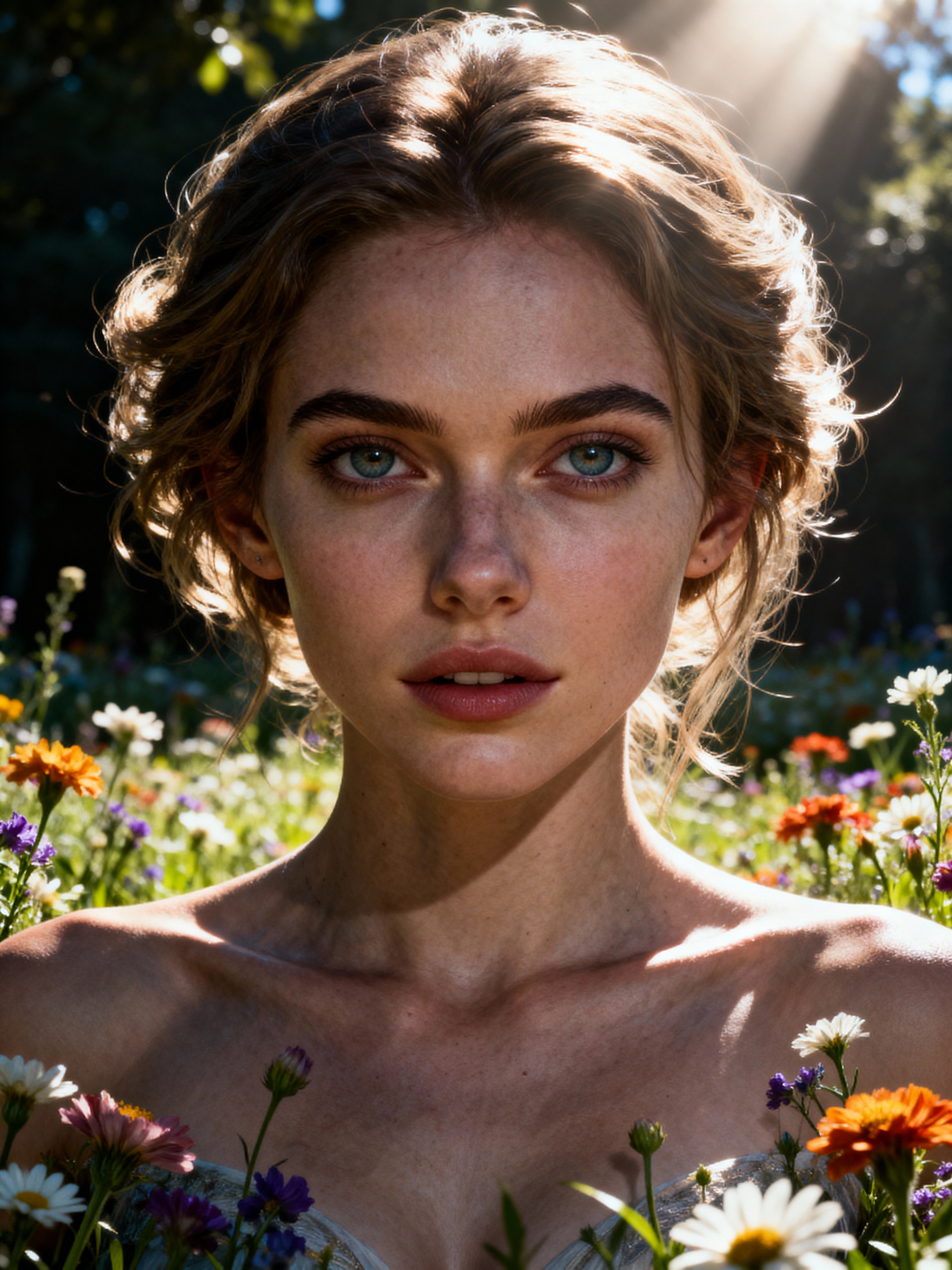 model | standing in field full of flowers | detailed gorgeous face! ! | full body! ! | god rays | intricate | elegant | realistic | hyperrealistic | cinematic | character design | concept art | illustration | digital art | digital painting | depth of field