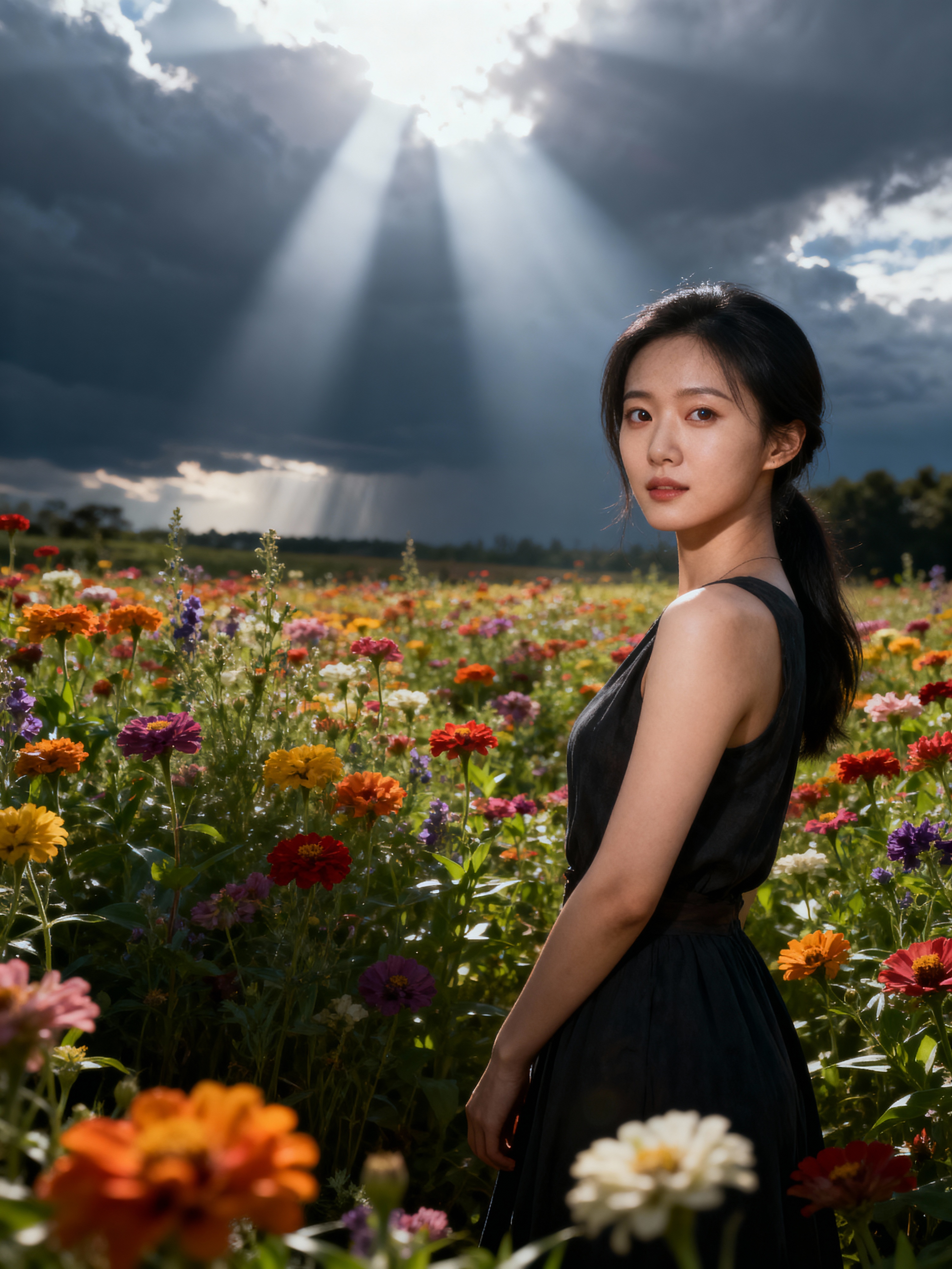 model | standing in field full of flowers | detailed gorgeous face! ! | full body! ! | god rays | intricate | elegant | realistic | hyperrealistic | cinematic | character design | concept art | illustration | digital art | digital painting | depth of field